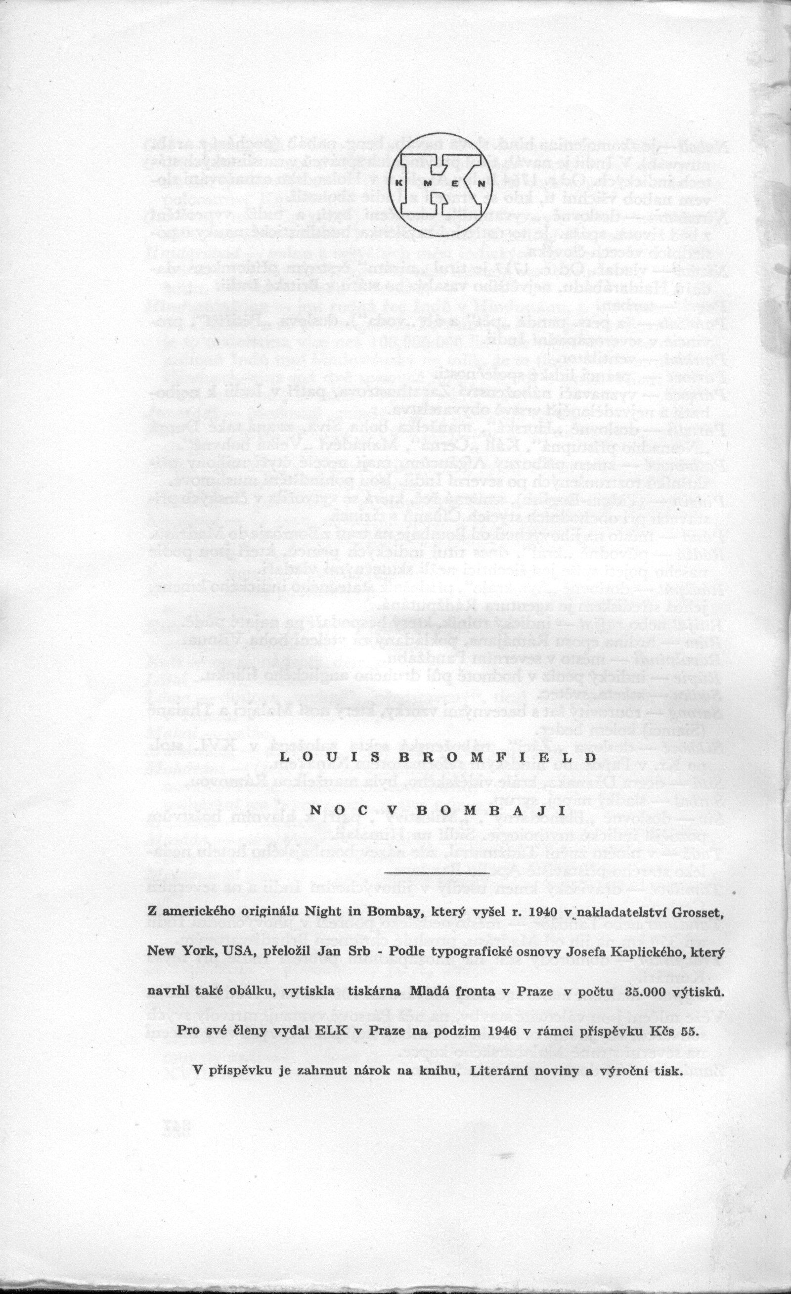 1. Title informationNoc v Bombaji / Louis Bromfield ; [z amerického originálu ... přeložil Jan Srb ; podle typografické osnovy Josefa Kaplického, který také navrhl obálku]