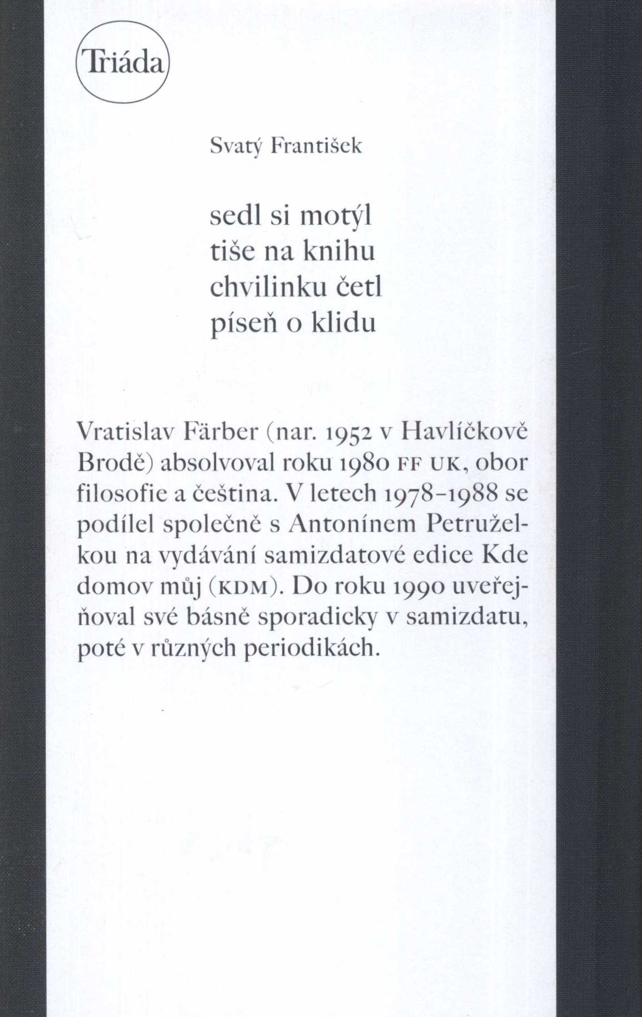Title informationLyrika : 1975-1988 / Vratislav Färber ; textové podklady k výboru shromáždil Antonín Petruželka ; vybrali, uspořádali a ediční poznámku napsali Robert Krumphanzl a Vratislav Färber ; obálku a grafickou úpravu vytvořil a z písma ... vysadil Michal Rydval