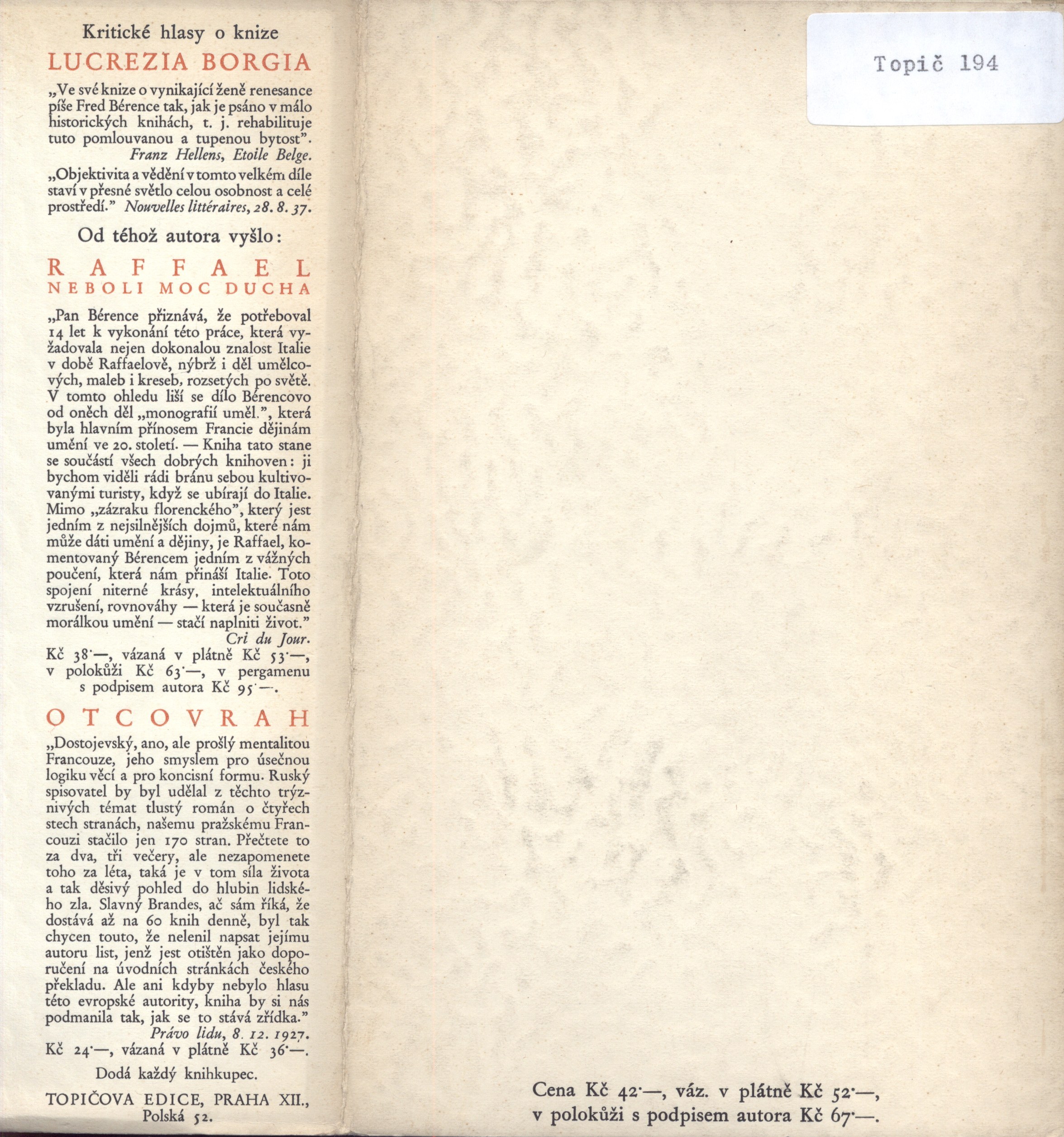 2. Title informationLucrezia Borgia / Fred Bérence ; z francouzštiny přeložil Václav Renč ; [dřevoryt a grafická úprava Cyrila Boudy]