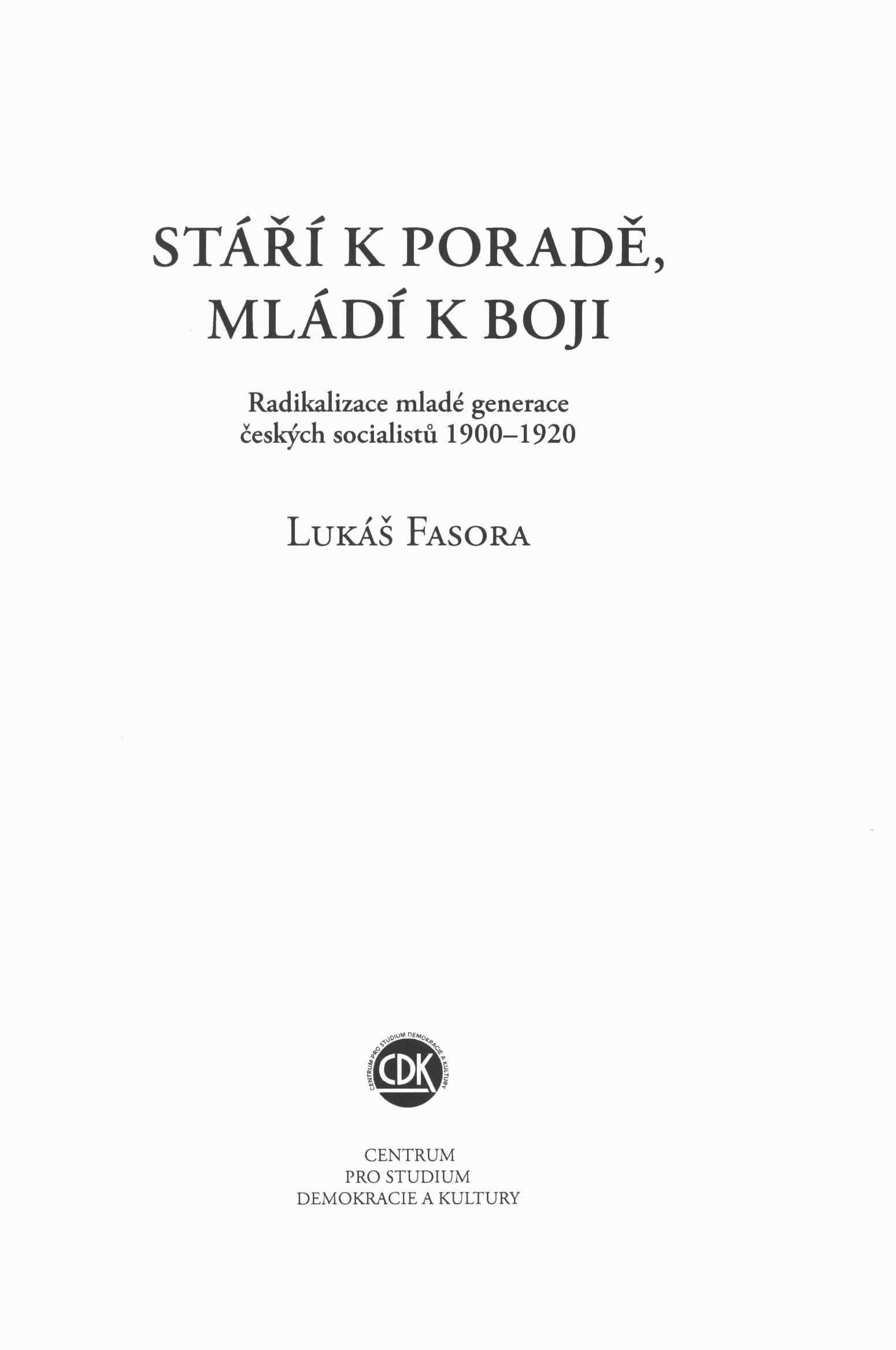 1. Title informationStáří k poradě, mládí k boji : radikalizace mladé generace českých socialistů 1900-1920 / Lukáš Fasora ; [typografie Zdeněk Granát]
