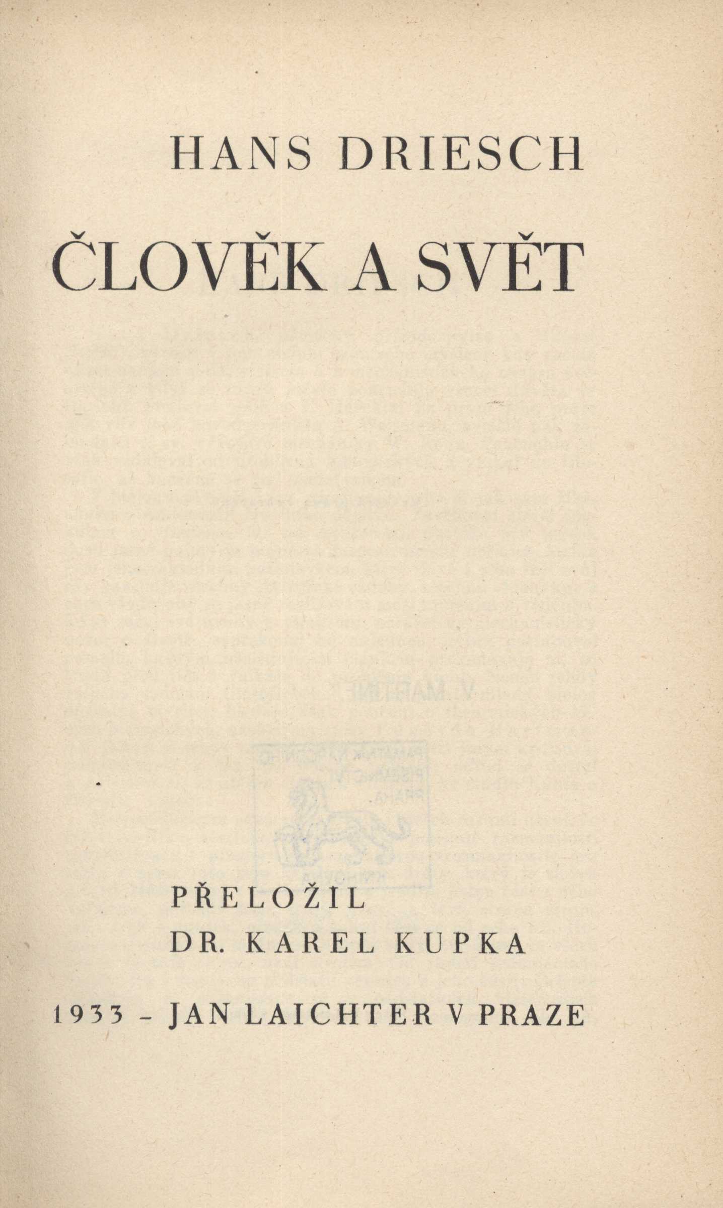 5. Názvové údajeČlověk a svět / Hans Driesch ; přeložil Karel Kupka