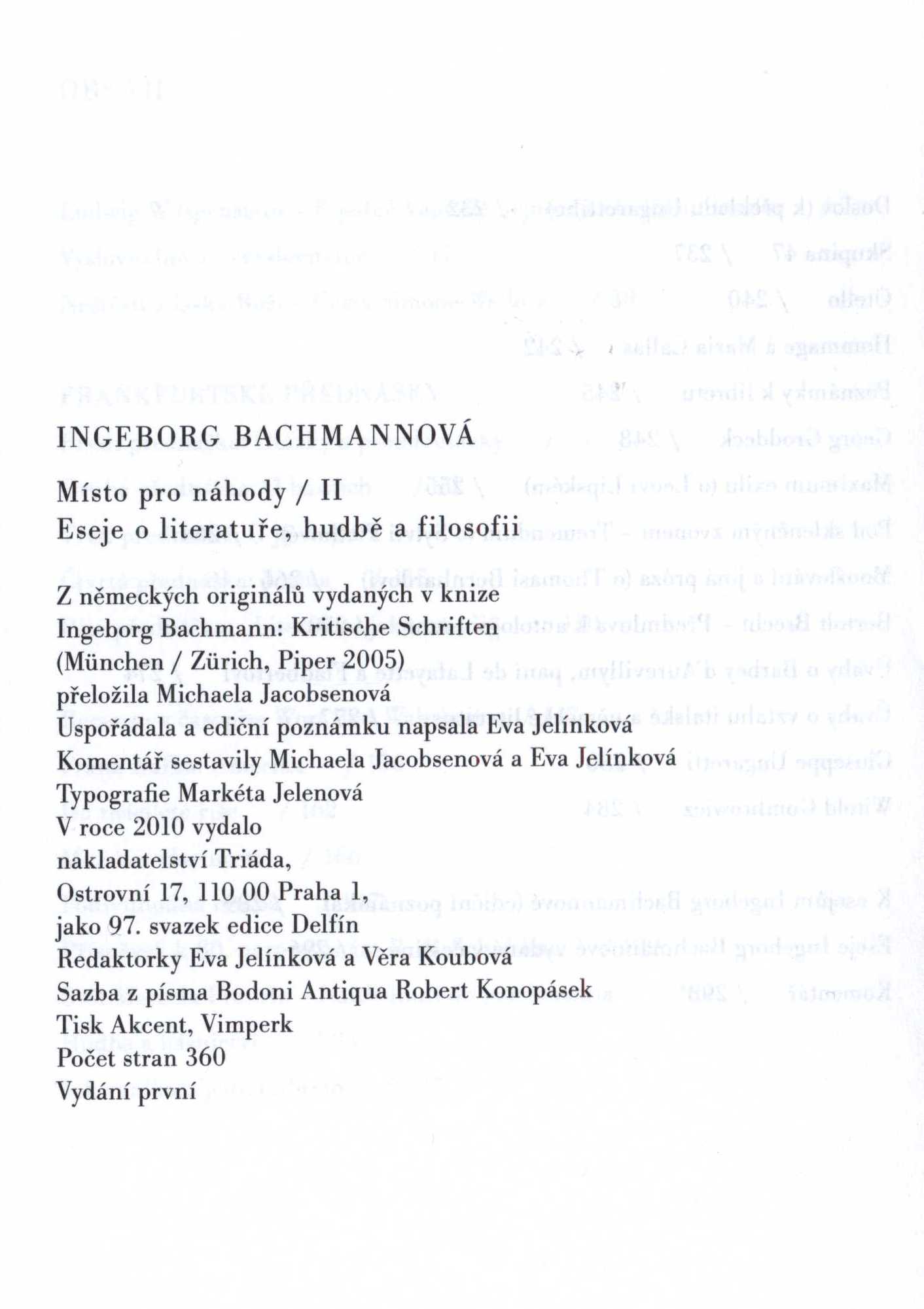 1. Title informationMísto pro náhody. II, Eseje o literatuře, hudbě a filosofii / Ingeborg Bachmannová ; výbor připravily Michaela Jacobsenová a Eva Jelínková ; přeložila Michaela Jacobsenová
