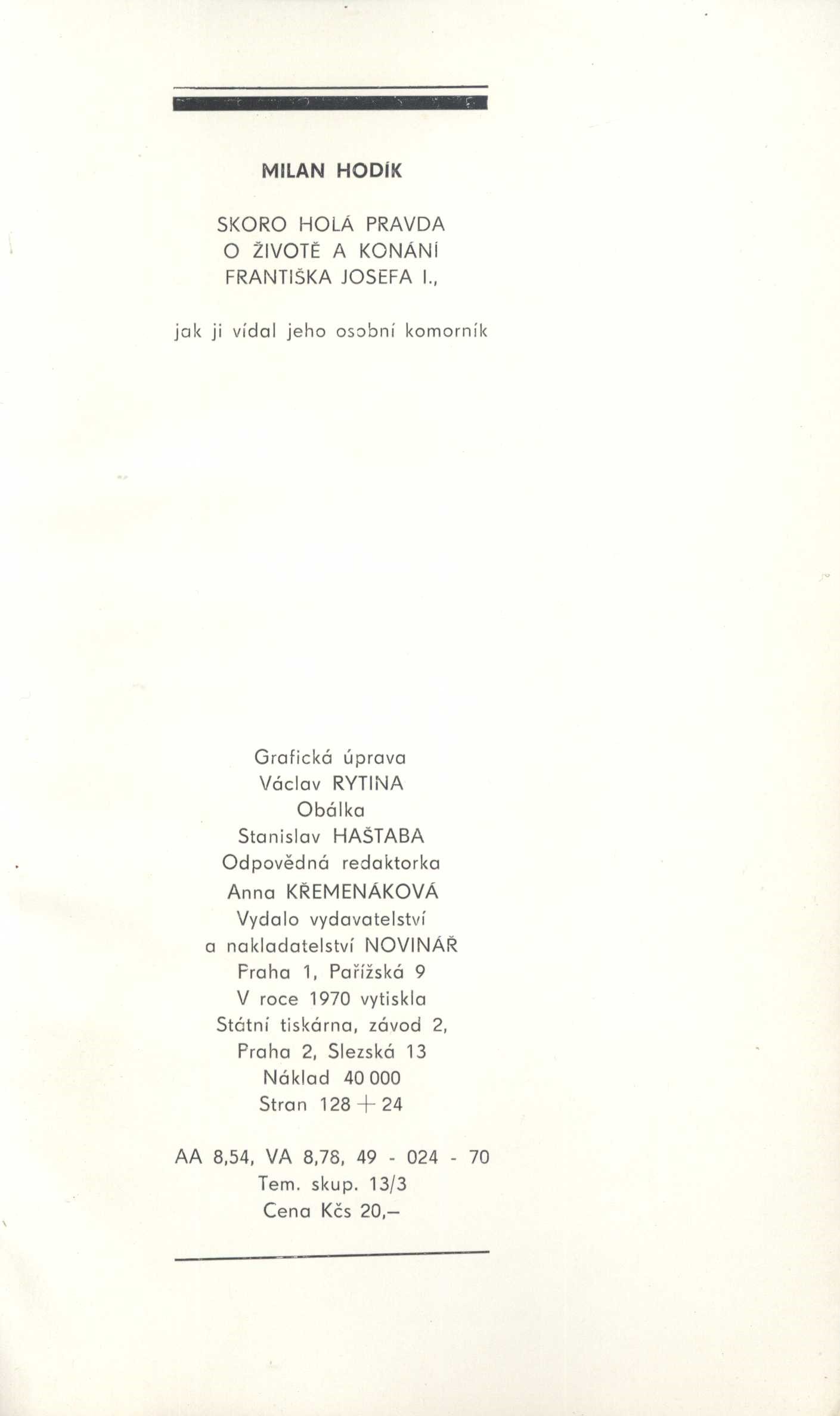 4. Title informationPaměti komorníka císaře Františka Josefa I. : skoro holá pravda o životě a konání Františka Josefa I., jak ji denodenně zblízka vídal jeho dlouholetý osobní komorník Eugen Ketterl / Milan Hodík