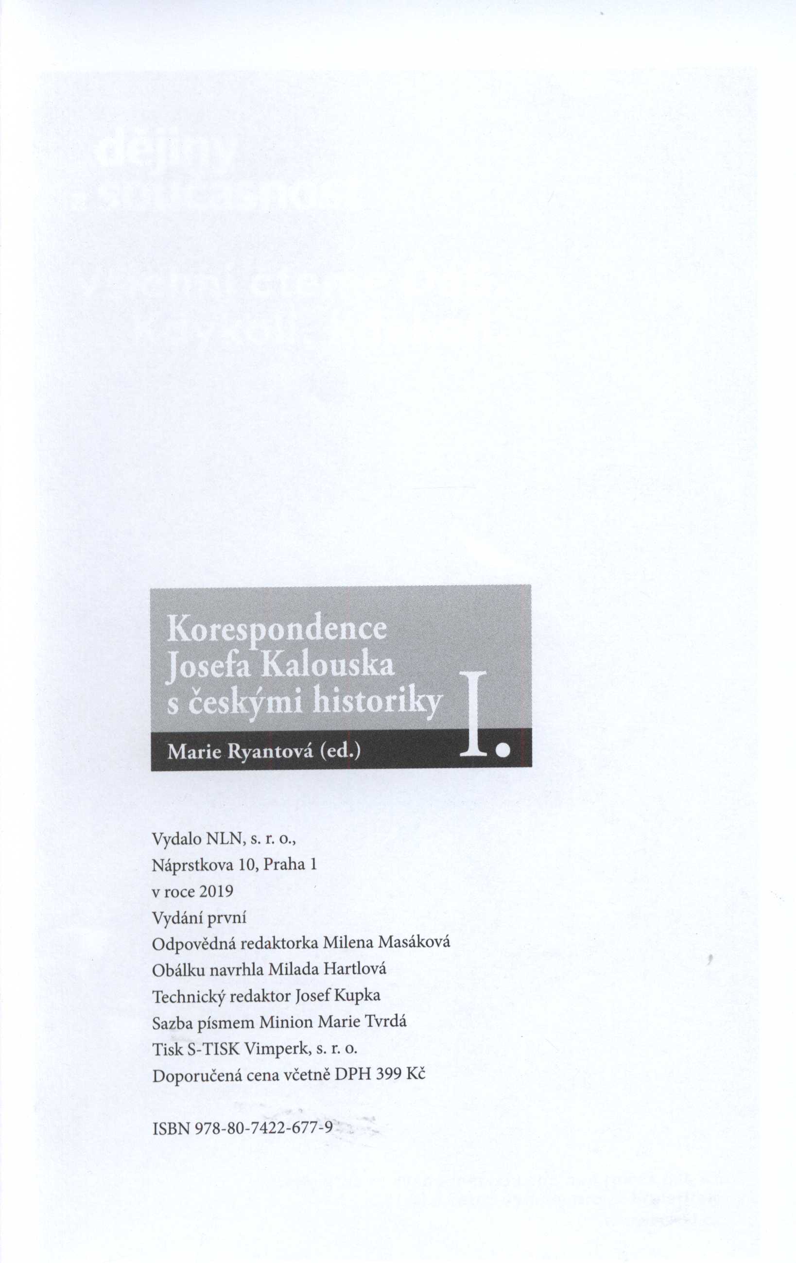 1. Title informationKorespondence Josefa Kalouska s českými historiky. I. / Marie Ryantová (ed.) ; obálku navrhla Milada Hartlová