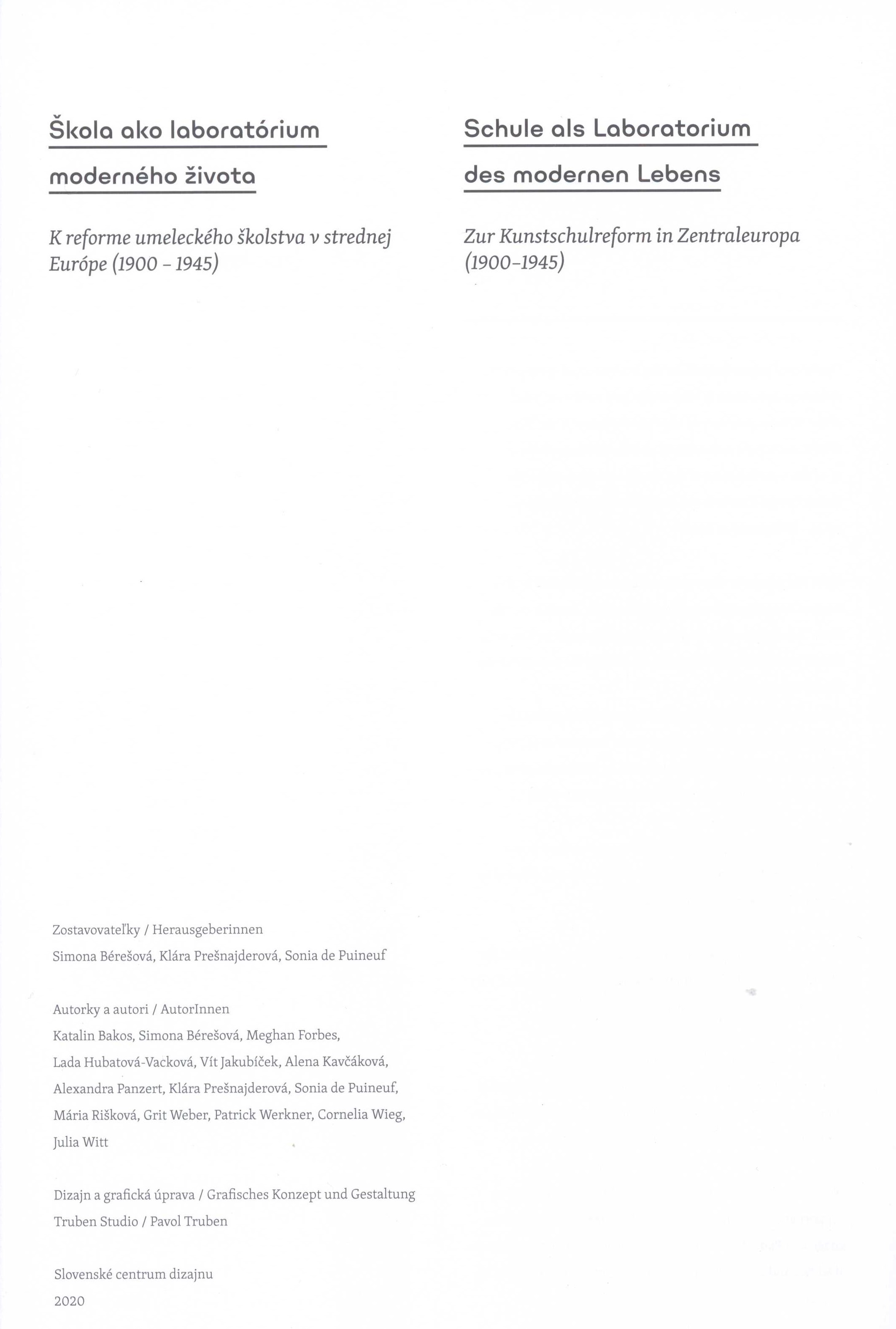 | Title information | Škola ako laboratórium moderného života : k reforme umeleckého školstva v strednej Európe (1900-1945) = Schule als Laboratorium des modernen Lebens. Zur Kunstchulreform in Zentraleuropa (1900-1945) = School as a laboratory of modern life. On the reform of art education in central Europe (1900-1945) / zostavovateľky Simona Bérešová, Klára Prešnajderová, Sonia de Puineuf ; autorky a autori: Katalin Bakos, Simona Bérešová, Meghan Forbes, Lada Hubatová-Vacková, Vít Jakubíček, Alena Kavčáková, Alexandra Panzert, Klára Prešnajderová, Sonia de Puineuf, Mária Rišková, Grit Weber, Patrick Wetrkner, Cornelia Wieg, Julia Witt ; dizajn a grafická úprava Truben Studio / Pavol Truben