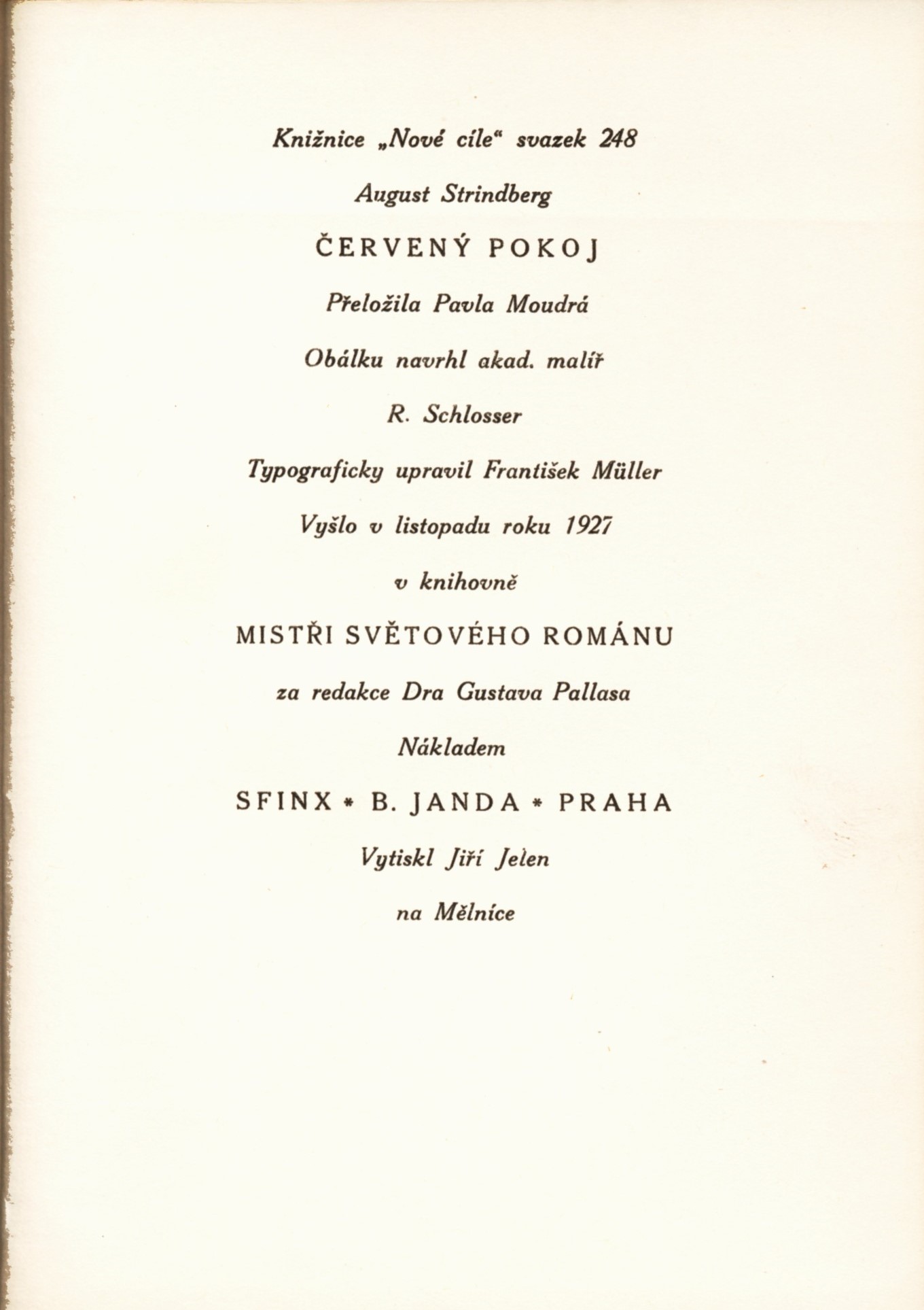 4. Názvové údajeČervený pokoj : obrazy ze života umělců a spisovatelů / August Strindberg ; ze švédského přeložila Pavla Moudrá
