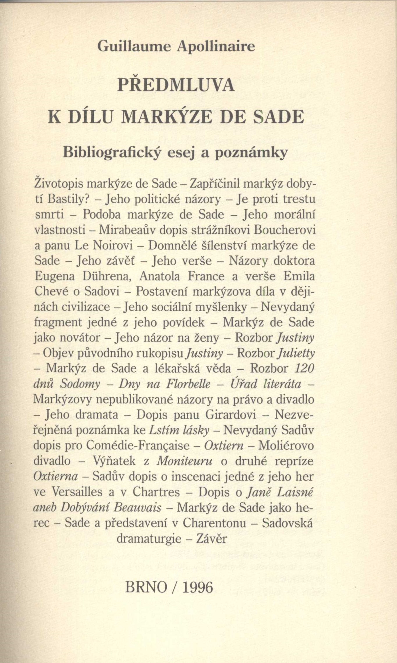 Keywords francouzská literatura * Apollinaire G. * předmluva * dílo * Sade markýz de * český překlad * Spoustová J. * r. 1996