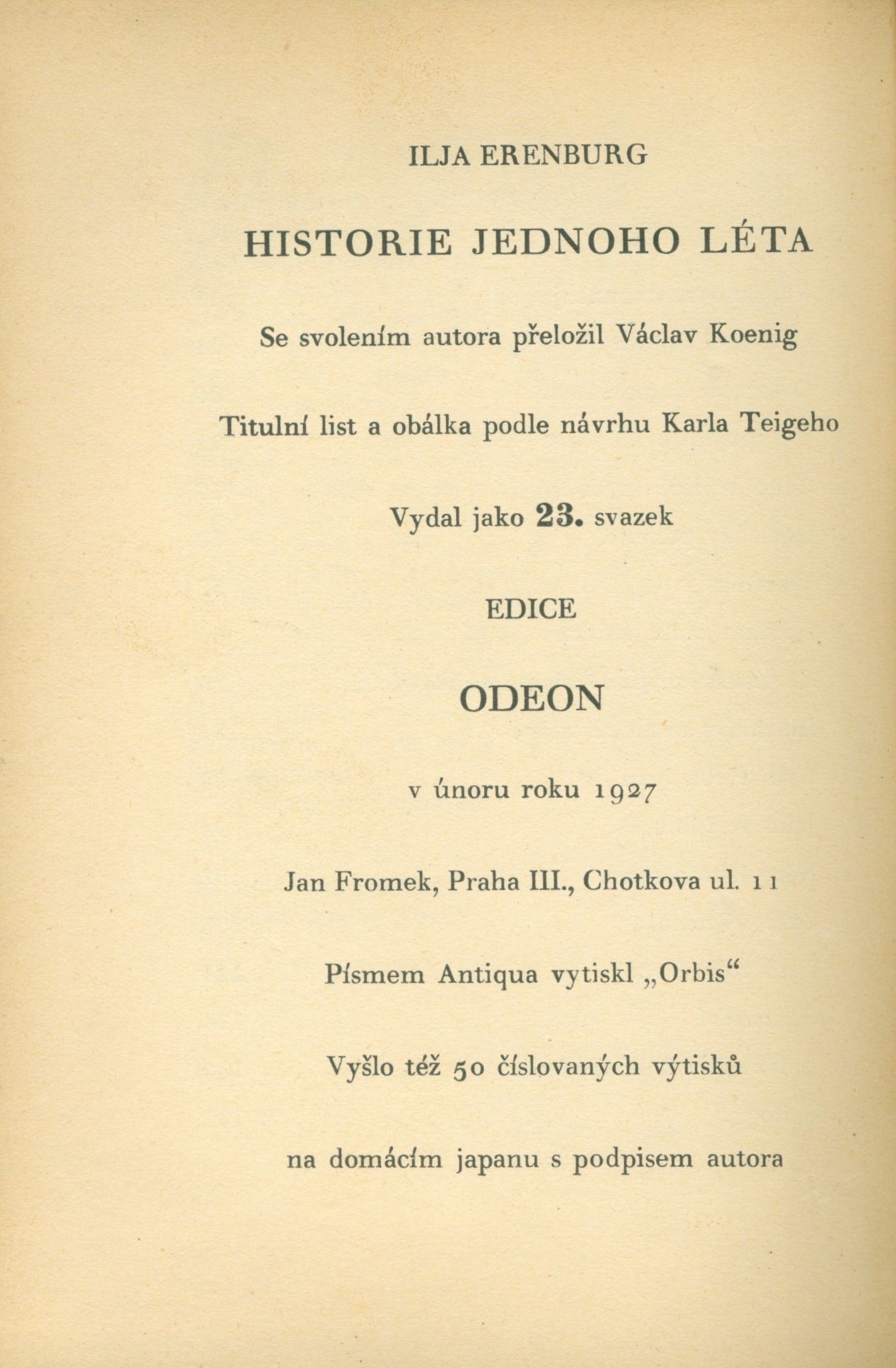 1. Title informationHistorie jednoho léta : román / Ilja Erenburg ; se svolením autora přeložil Václav Koenig