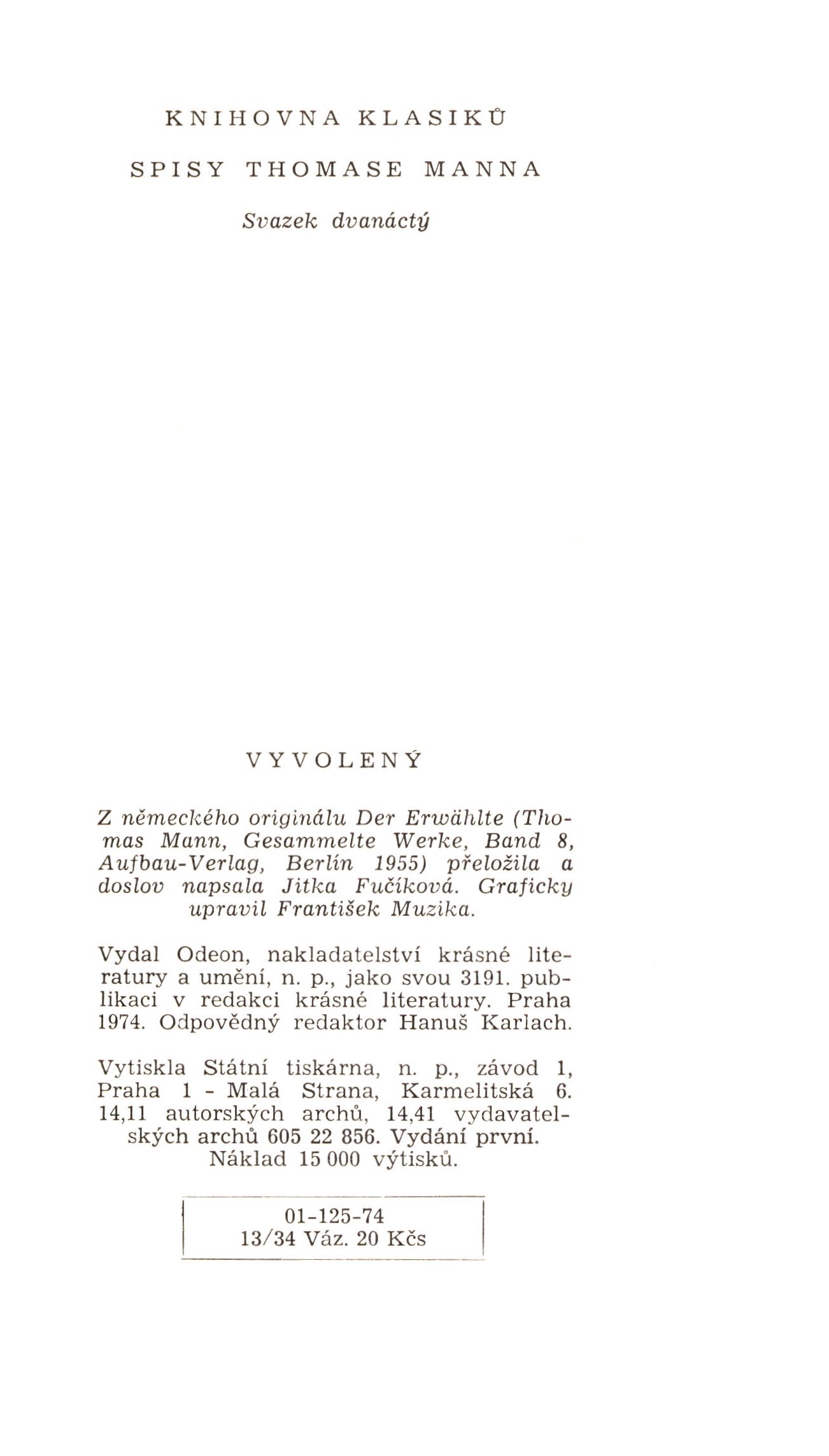 Title informationVyvolený / Thomas Mann ; z německéhooriginálu Der Erwählte ... překložila a doslov napsala Jitka Fučíková ; graficky upravil František Muzika
