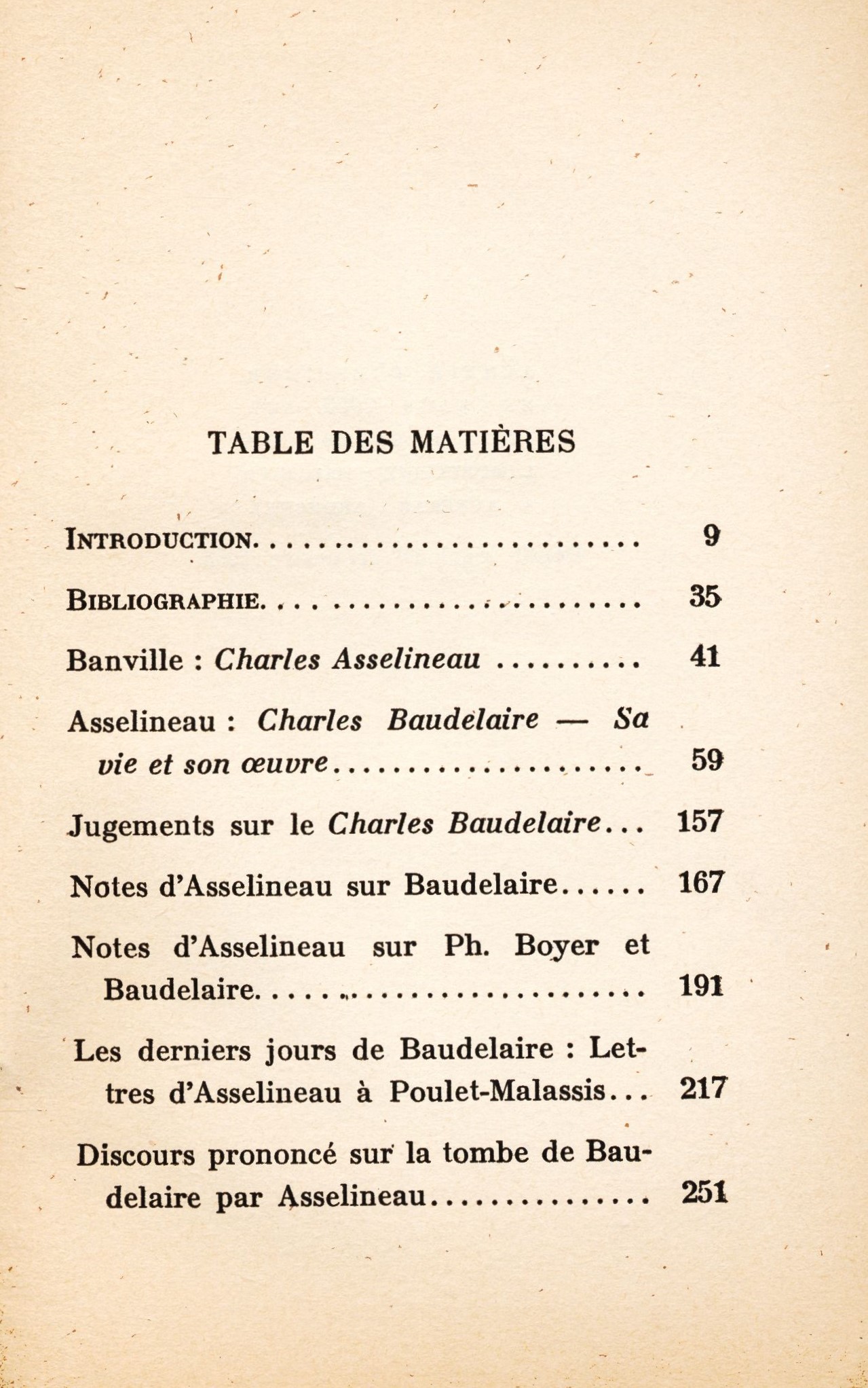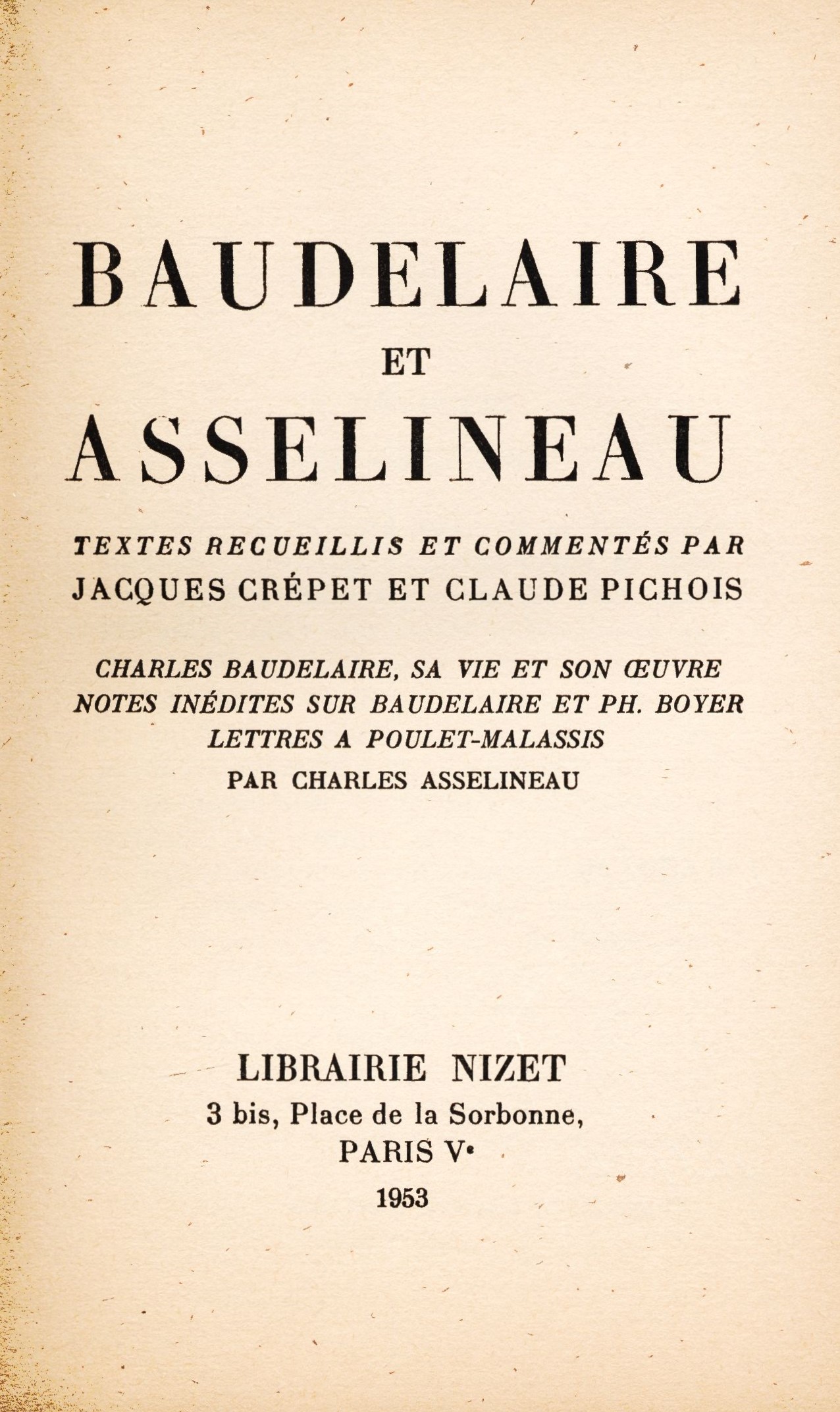 1. Title informationBaudelaire et Asselineau : Charles Baudelaire sa vie et son oeuvre, notes inédites sur Baudelaire et Ph. Boyer, lettres a Poulet-Malassis par Charles Asselineau / Textes recueillis et commentés par Jacques Crépet et Claude Pichois