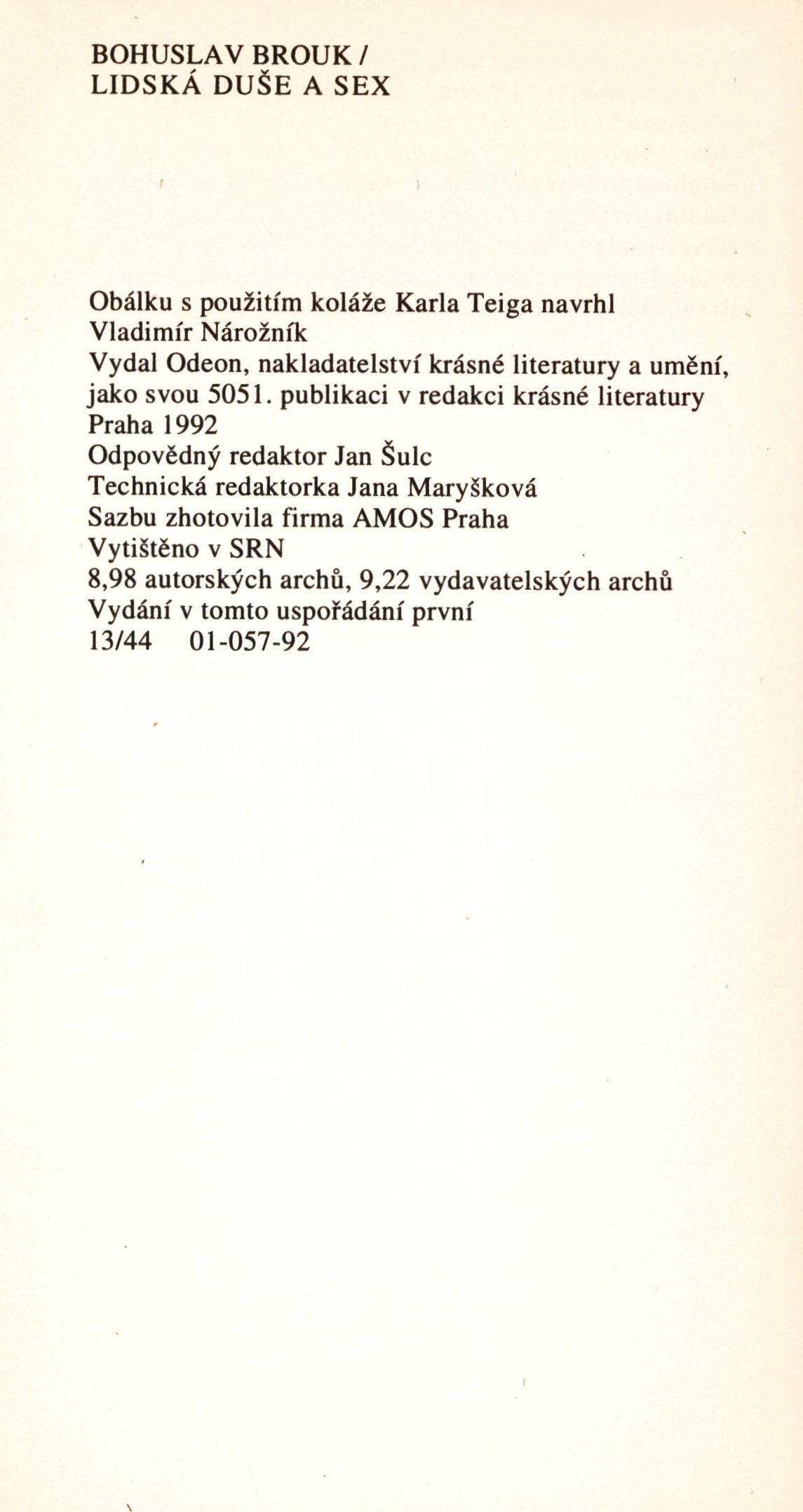 Title information Lidská duše a sex / Bohuslav Brouk ; obálku s použitím koláže Karla Teiga navrhl Vladimír Nárožník Personal name Brouk, Bohuslav, 1912-1978 (Author) Další autoři Nárožník, Vladimír, 1939-2002 (Graphic technician) Corporation Odeon (nakladatelství) (Publisher) Edition statement Vydání v tomto uspořádání první Publication [Praha] : Odeon, 1992 Manufacture Vytištěno v SRN Scope 138 stran ; 19 cm ISBN 80-207-0406-X (brožováno) Edition Pocket Program / řada C