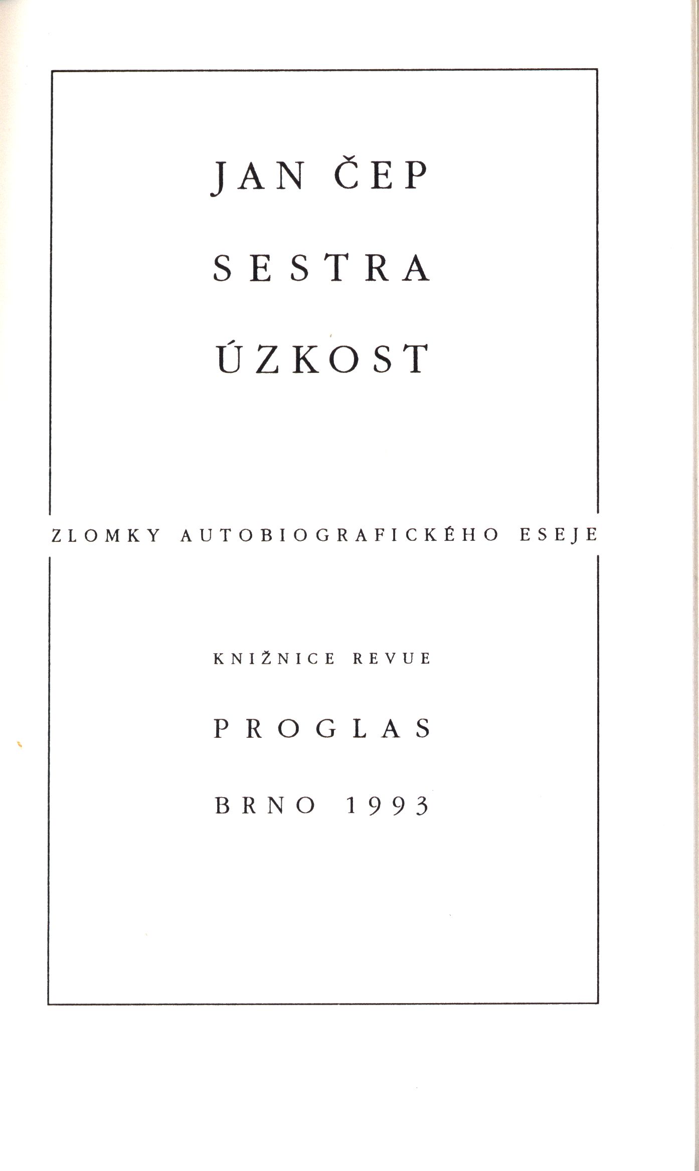 Title information Sestra úzkost : zlomky autobiografického eseje / Jan Čep ; přeložili Václav Čep a Bedřich Fučík ; k vydání připravil, [doslov a ediční pozn. napsal] Mojmír Trávníček ; obálka a typografie Jiří Šindler Personal name Čep, Jan, 1902-1974 (Author) Další autoři Čep, Václav, 1908-1985 (Translator) Fučík, Bedřich, 1900-1984 (Translator) Trávníček, Mojmír, 1931-2011 (Editor) (Author of afterword, colophon, etc.) (Author of introduction) Šindler, Jiří, 1938-2022 (Bookjacket designer) (Dedicator) Vladislav, Jan, 1923-2009 (Dedicatee) Mrštíková, Marie (Dedicatee) Corporation Centrum pro studium demokracie a kultury (Publisher) Tisk - Sýkora Brno (tiskárna) (Printer) Edition statement 2. doplněné vydání Publication Brno : Centrum pro studium demokracie a kultury, 1993 Manufacture Sýkora Scope 127 stran, 3 nečíslované listy obrazové přílohy : fotografie ; 20 cm ISBN (brožováno) Edition Knižnice revue Proglas. Osobnosti sv. 1