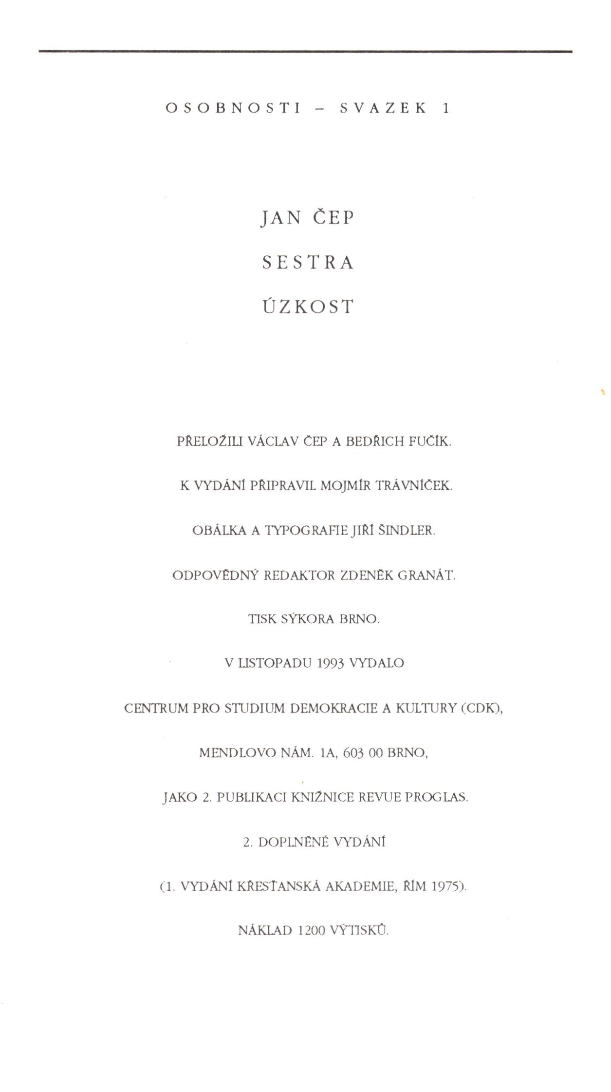 Knižnice revue Proglas, Osobnosti (Centrum pro studium demokracie a kultury)Country Czech Republic Language Czech Language of the original French Note Zdobená obálka. - Frontispis. - Fotografie. - Vysvětlivky. - Doslov. - Ediční poznámka. - Poprvé vyšlo v Křesťanské akademii, Řím 1975.