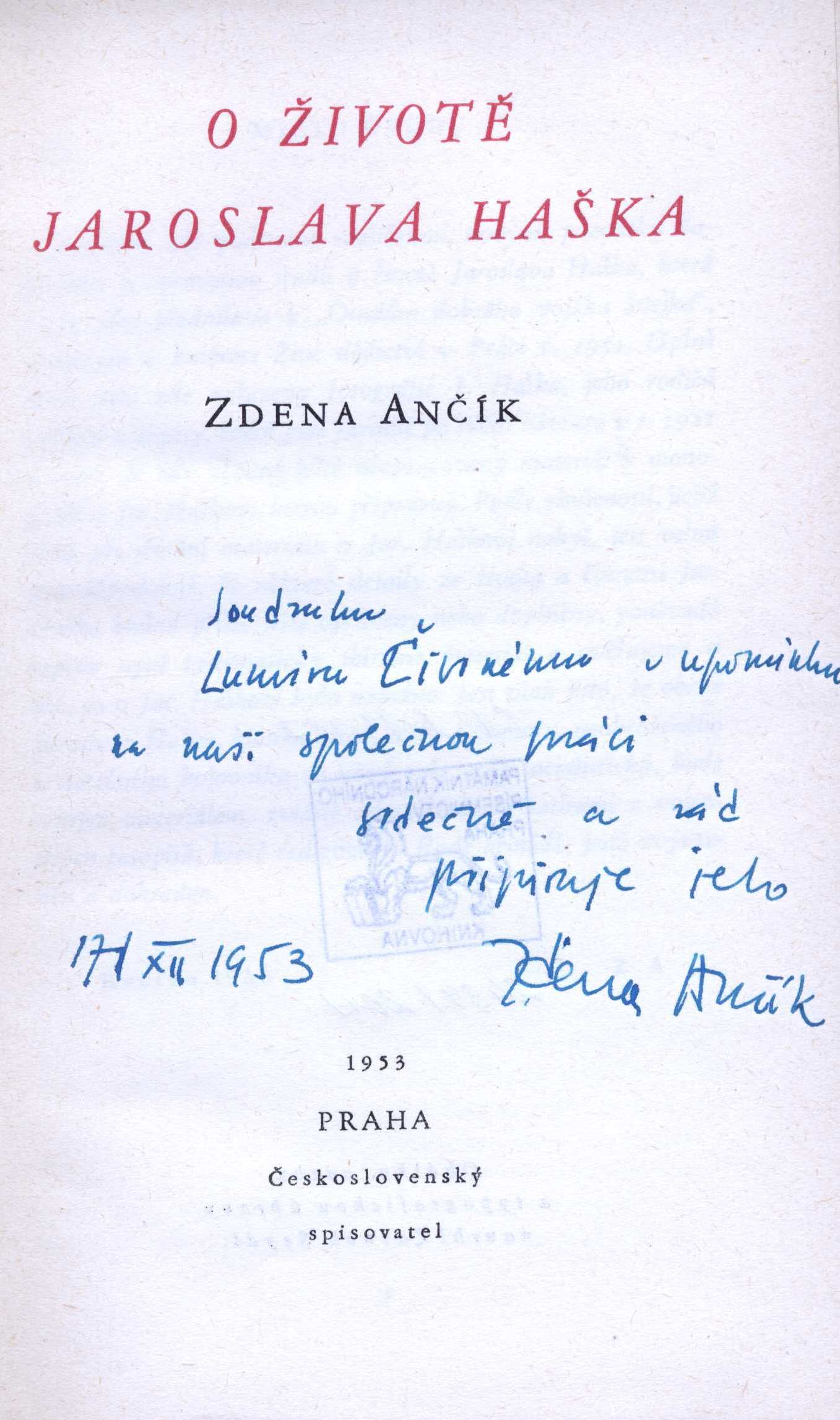Title information O životě Jaroslava Haška / Zdena Ančík ; obálku, vazbu, předsádku a typografickou úpravu navrhl Zdenek Seydl Personal name Ančík, Zdena, 1900-1972 (Author) Další autoři Seydl, Zdenek, 1916-1978 (Bookjacket designer) (Binding designer) (Typographer) Corporation Československý spisovatel (nakladatelství) (Publisher) Brněnské knihtiskárny (Printer) Edition statement Vydání 1. Publication Praha : Československý spisovatel, 1953 Manufacture V Brně : Brněnské tiskárny Scope 107 stran, 16 nečíslovaných stran obrazových příloh ; 20 cm ISBN vázáno Country Czech Republic Language Czech Note Zdobený přebal. - Na záložce přebalu poznámka o knize. - Proti titulu portrét J. Haška. - Černopbílé fotografie na příloze