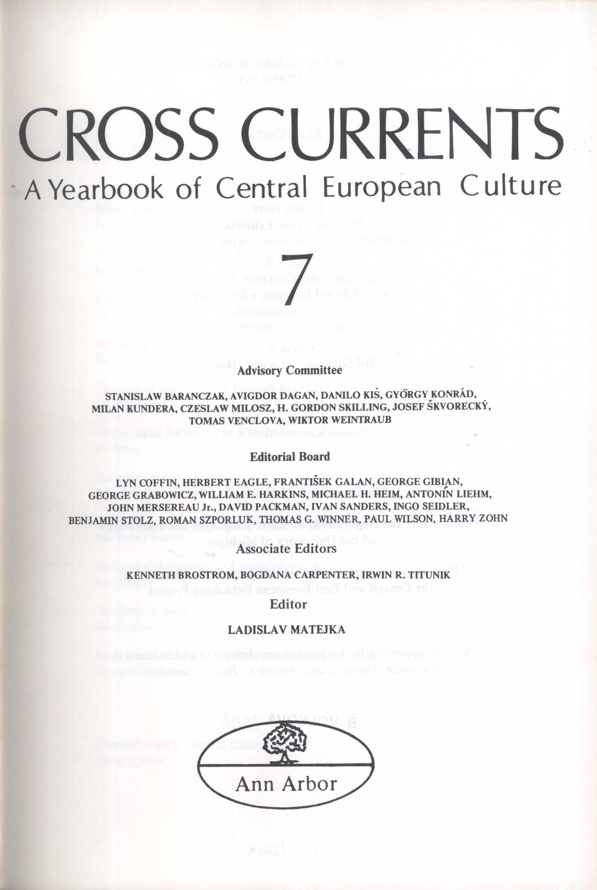Title information Cross currents : a Yearbook of Central European Culture / editor Ladislav Matejka Další autoři Matějka, Ladislav, 1919-2012 (Editor) Corporation University of Michigan (Publisher) Roč., číslo 7, 1988 Publication Ann Arbor : University of Michigan, [1988] Copyright notice date by Ladislav Matejka ©1988 Scope 504 stran : ilustrace, fotografie, portréty ; 25,5 cm ISBN (Brožováno) ISSN 0748-0164 Edition Michigan Slavic Materials ; no. 29