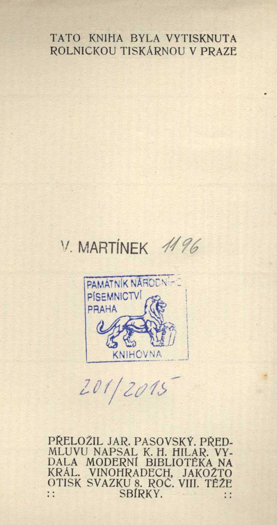 Sign. VMartínek 1196: Knihovna Vojtěcha Martínka. - Chybí přední strana obálky.