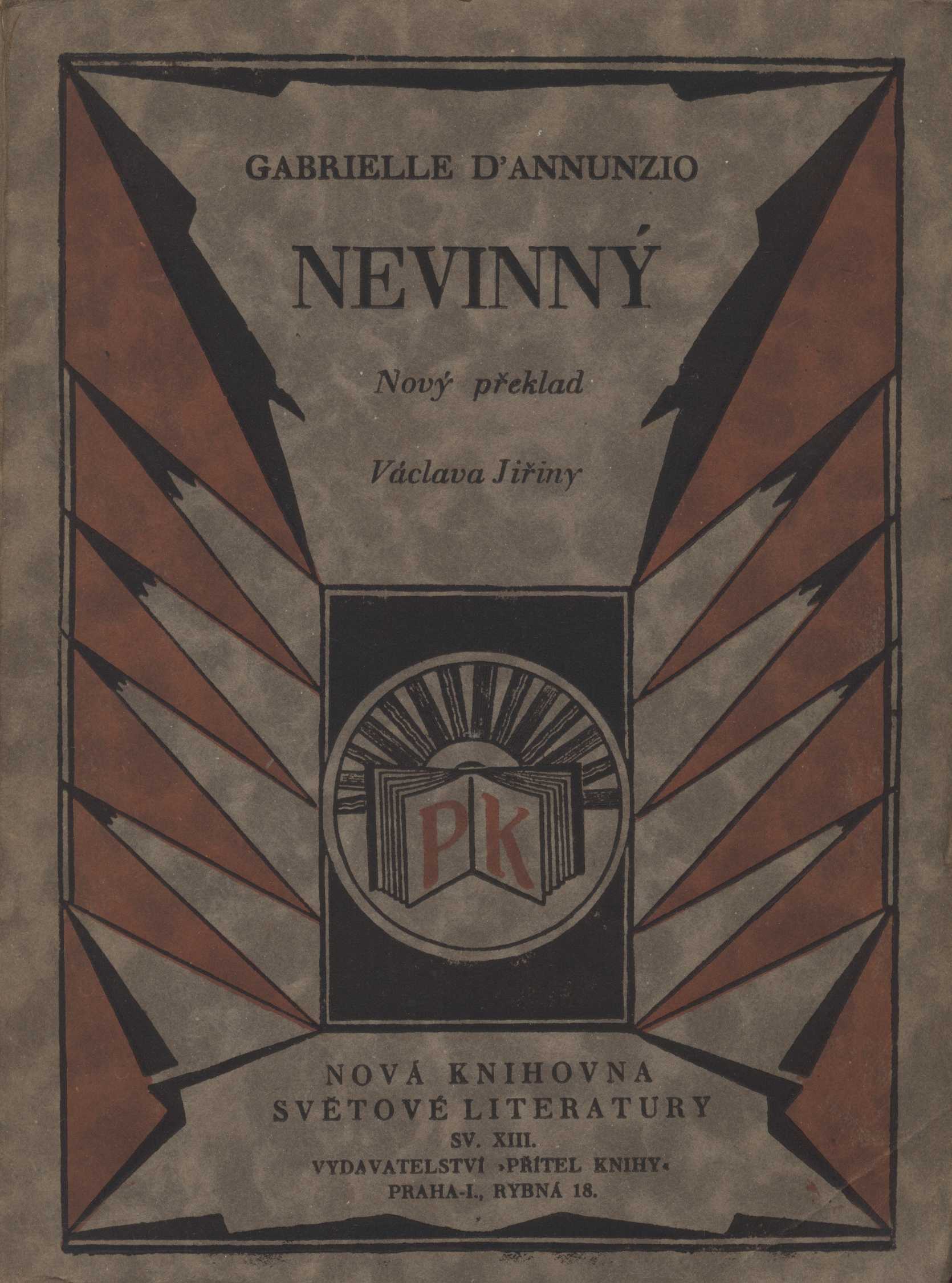 Title information Nevinný / Gabriele d'Annunzio ; nový překlad Václava Jiřiny Personal name D'Annunzio, Gabriele, 1863-1938 (Author) Další autoři Jiřina, Václav, 1886-1946 (Translator) Corporation Přítel knihy (nakladatelství) (Publisher) Legiografie (tiskárna) (Printer) Publication Praha : Přítel knihy, 1928 Manufacture Legiografie Scope 275 stran ISBN (Brožováno) Edition Nová knihovna světové literatury ; roč. I., sv. 13