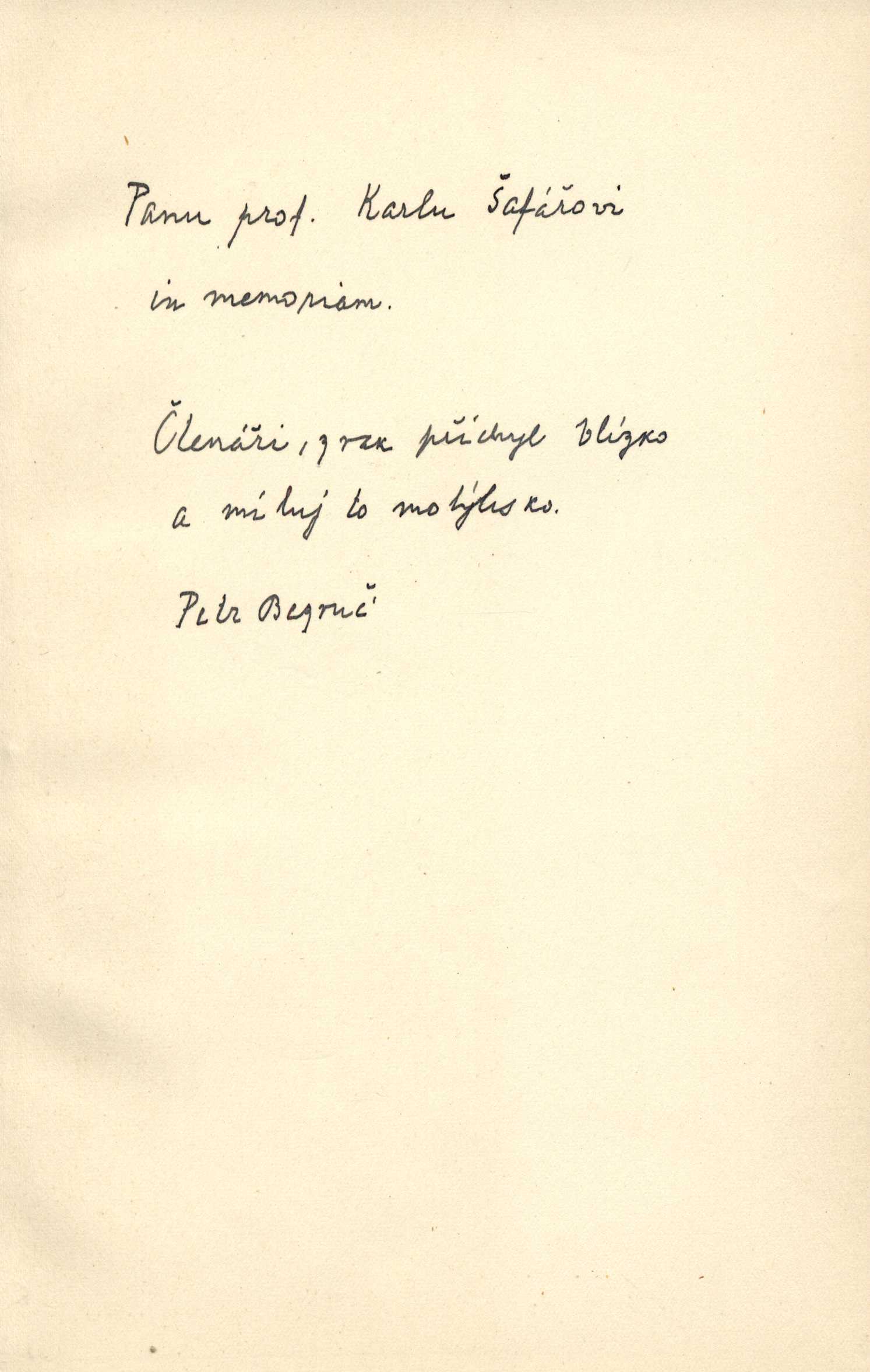 Title information Stužkonoska modrá / Petr Bezruč ; ilustroval Max Švabinský ; typograficky upravil Method Kaláb Personal name Bezruč, Petr, 1867-1958 (Author) (Dedicator) Další autoři Švabinský, Max, 1873-1962 (Illustrator) (Bookjacket designer) Kaláb, Method, 1885-1963 (Typographer) Šafář, Karel, 1889-1970 (Dedicatee) Corporation Československý spisovatel (nakladatelství) (Publisher) Orbis (tiskárna) (Printer) Edition statement První vydání Publication Praha : Československý spisovatel, 1952 Manufacture Orbis 3 ; Orbis závod 2 Scope 28 stran, 6 nečíslovaných stran obrazových příloh ; 21,5 cm ISBN (Vázáno) Country Czech Republic Language Czech Note Ilustrace na obálce a vazbě. - Frontispis. - Barevné i černobílé reprodukované kresby. - Poznámky. - Vydáno k 85. narozeninám P. Bezruče.