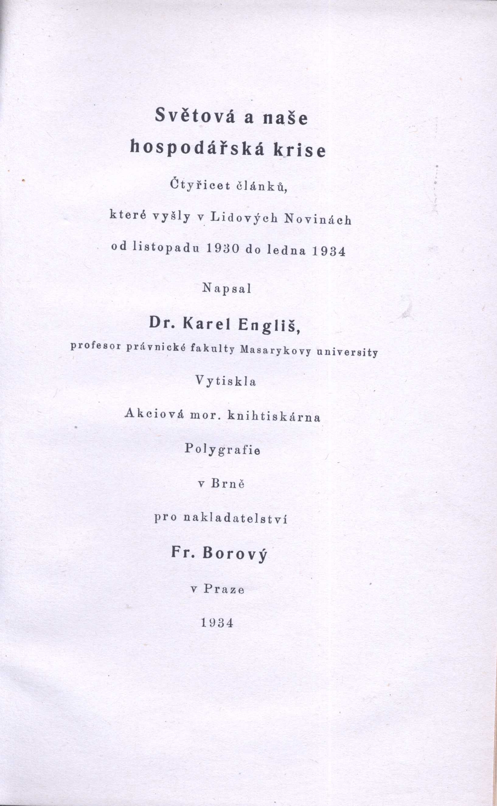 Title information Světová a naše hospodářská krise : čtyřicet článků z Lidových Novin od listopadu 1930 do ledna 1934 / Karel Engliš Personal name Engliš, Karel, 1880-1961 (Author) Další autoři Fr. Borový (firma) (Publisher) Polygrafia (nakladatelství a tiskárna, Brno) (Printer) Publication Praha : Fr. Borový, 1934 Manufacture Akciová mor. knihtiskárna Polygrafie) Scope 217 s. ; 8° ISBN (váz.) Country -cs Language Czech Note Plátěná vazba s názvem na štítku a na hřbetu knihy. - Nakladatelská značka. - Předmluva. - Tabulky a grafy v textu. - Papírové pouzdro.