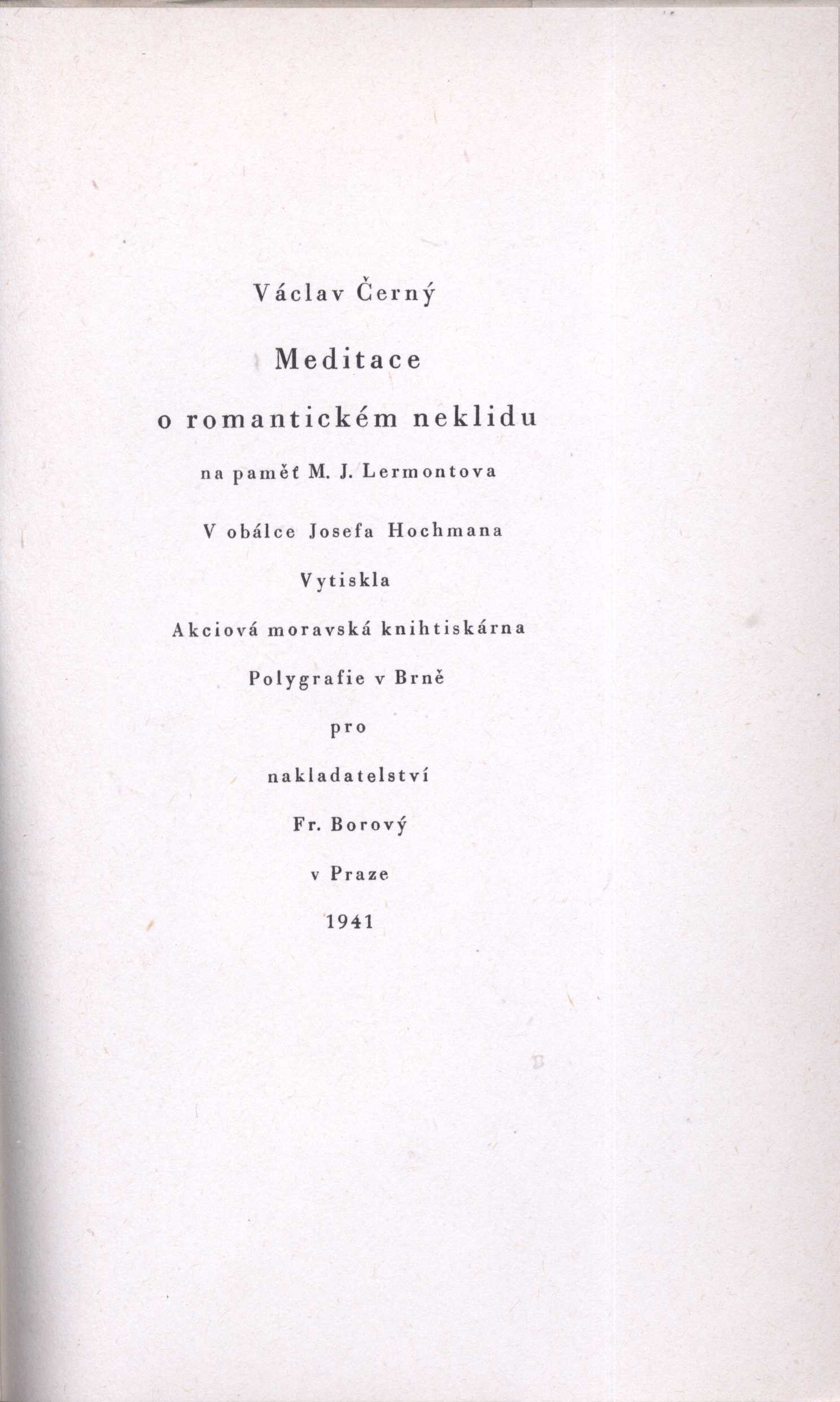 Title information Meditace o romantickém neklidu : na paměť M.J. Lermontova / Václav Černý ; [v obálce Josefa Hochmana] Personal name Černý, Václav, 1905-1987 (Author) Další autoři Hochman, Josef, 1913-1999 (Bookjacket designer) Corporation Fr. Borový (firma) (Publisher) Akciová moravská knihtiskárna Polygrafie (Printer) Publication V Praze : František Borový, 1941 Manufacture Akciová moravská knihtiskárna) Scope 64 s. ; 21 cm ISBN brož. Country -cs Language Czech Note Papírová obálka. - Nakladatelská značka. - Poznámky a odkazy. - Na zadní straně obálky značka nakladatelského sdružení Kmen.