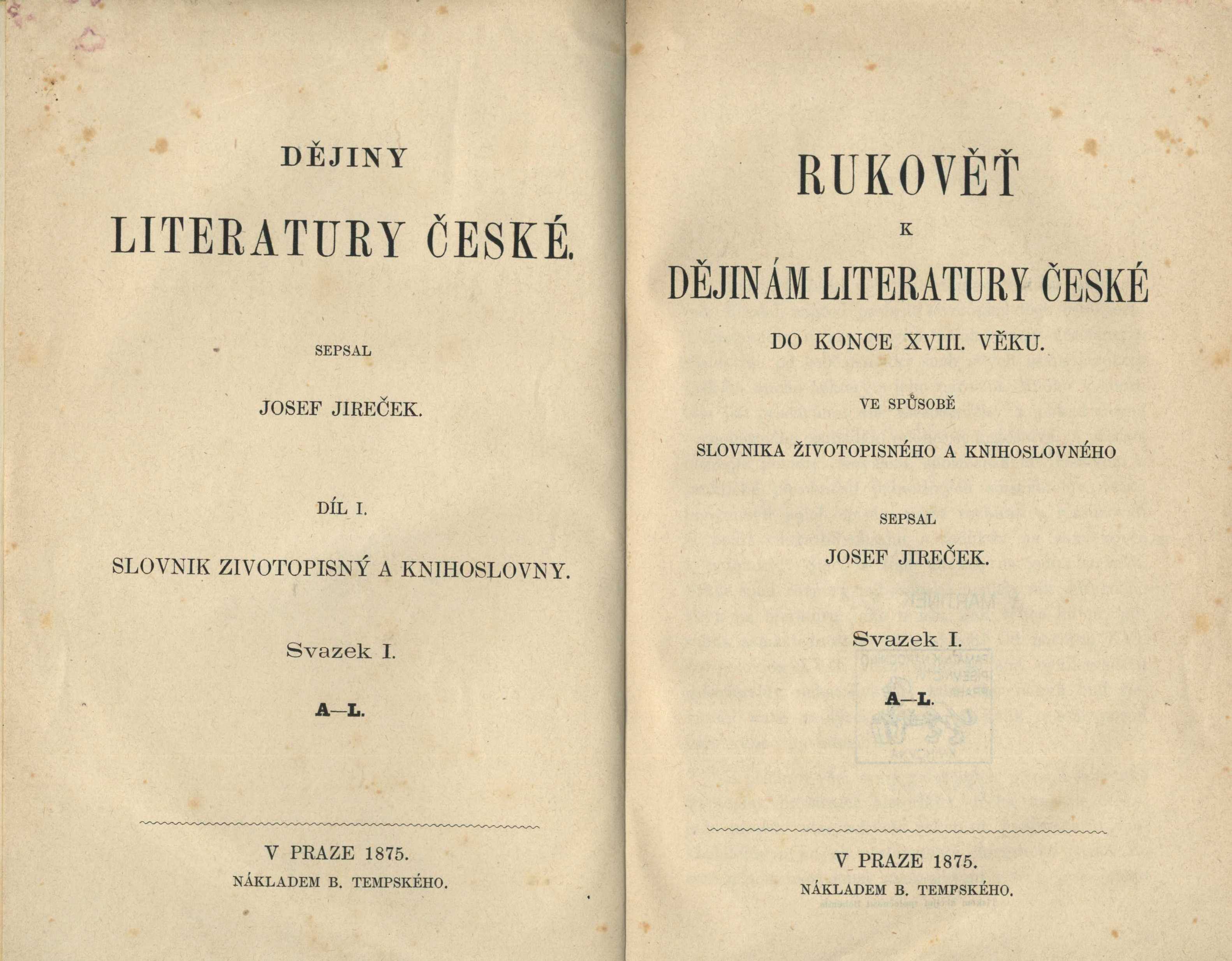 Title information Rukověť k dějinám literatury české : do konce XVIII. věku : ve spůsobě slovnika [sic] životopisného a knihoslovného. Svazek I.. A-L / sepsal Josef Jireček Personal name Jireček, Josef, 1825-1888 (Author) Další autoři Karásek ze Lvovic, Jiří, 1871-1951 (Inscriber) Soldát, Hynek, 1850-1915 (Former owner) Tempsky, Friedrich, 1821-1902 (Publisher) Corporation Bohemia (akcijní společnost) ([Praha?]) (Printer) Další var.názvy Dějiny literatury České : slovník zivotopisný [sic] a knihoslovny [sic] Publication V Praze : Nákladem B. Tempského, 1875 Manufacture (Bohemia) Scope 489 s. ISBN (váz.) Country Czech Republic Language Czech Note Úvod autora. -- Výklad zkratkův. -- Opravy. -- První svazek díla zahrnuje hesla A-L.