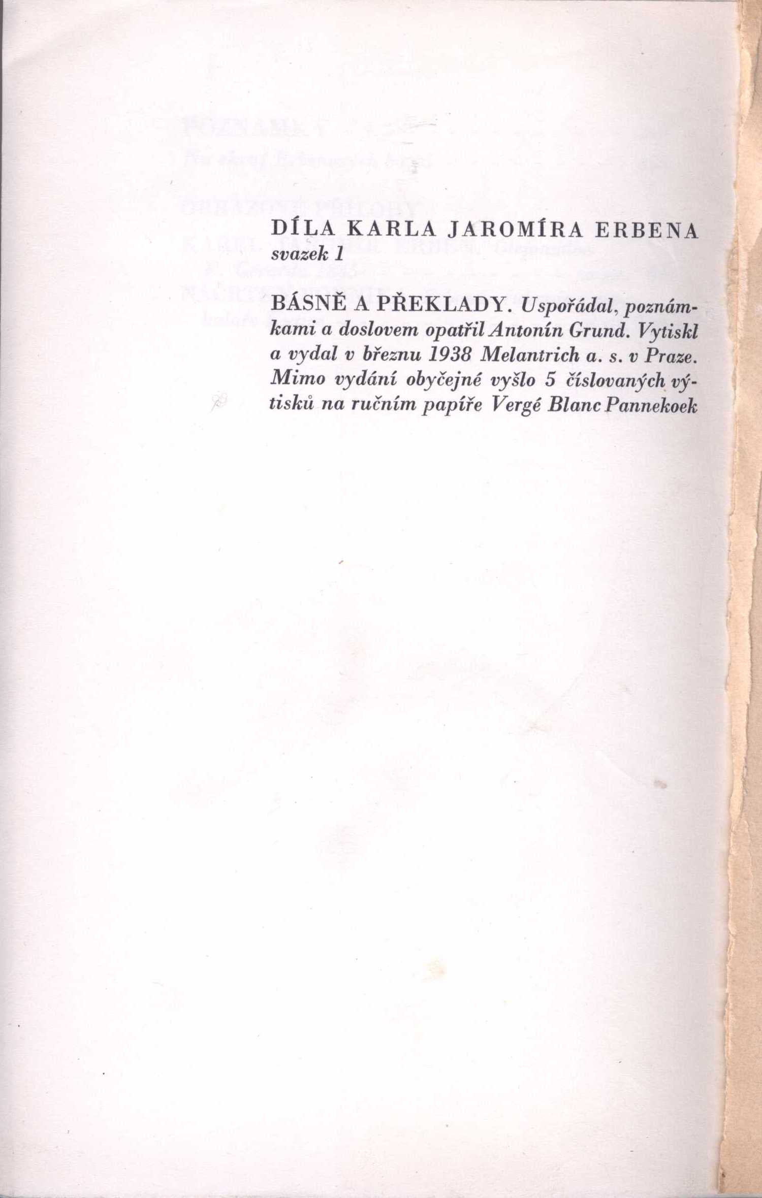 1. Title informationBásně a překlady / Karel Jaromír Erben ; uspořádal, poznámkami a doslovem opatřil Antonín Grund