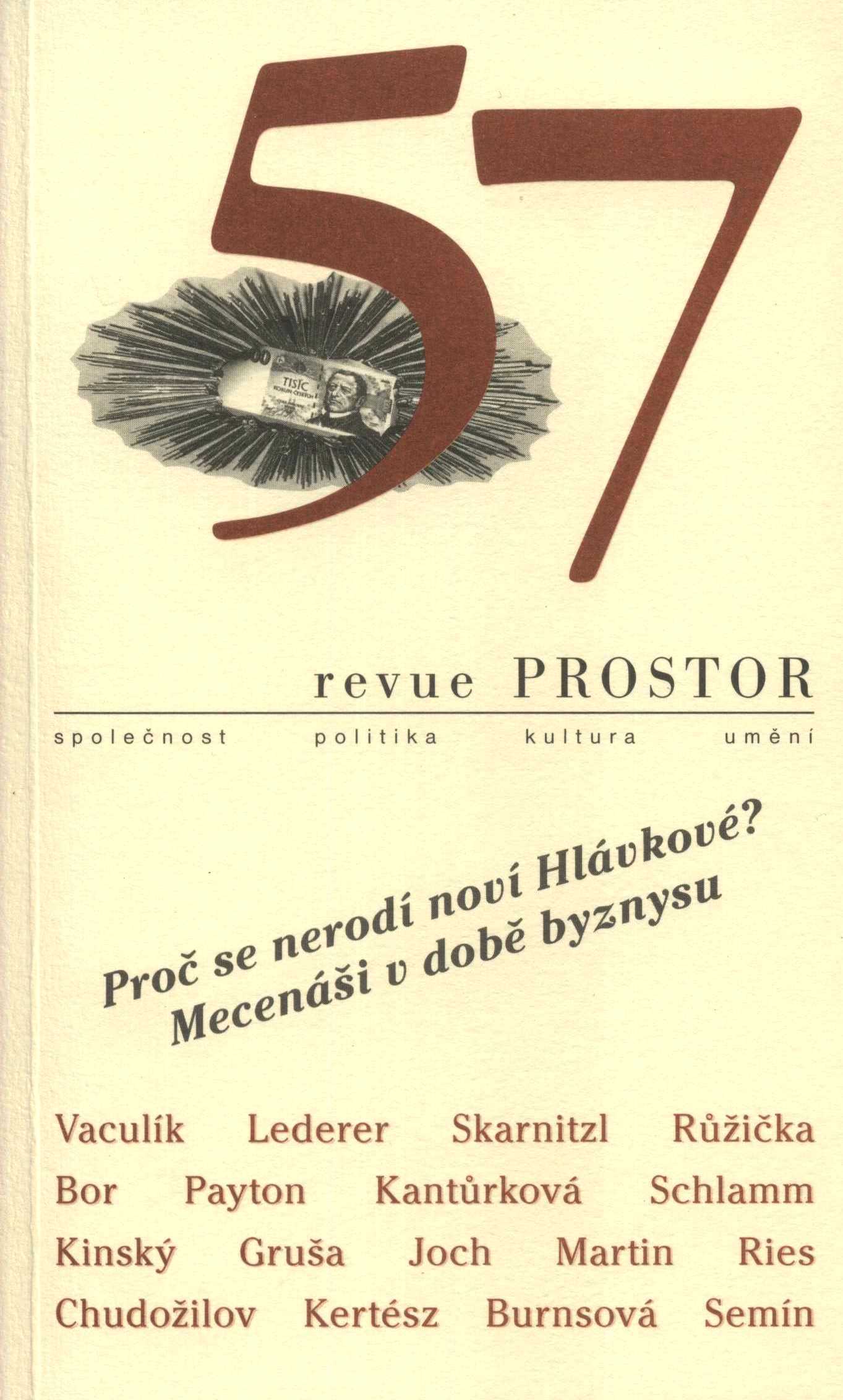 Title information Revue Prostor : společnost - politika - kultura - umění : společensko-kulturní revue Další autoři Hanuš, Milan, 1955- (Redactor) Corporation Sdružení pro vydávání revue Prostor (Publisher) Roč., číslo Číslo 57-60, 2003 Další var.názvy Číslo 57 Proč se nerodí noví Hlávkové? Mecenáši v době byznysu Číslo 58-59 Rodí se nový pohled na zdraví a nemoc? Číslo 60 Přichází věk Vodnáře? Hledání nové spirituality Publication Praha : Sdružení pro vydávání revue Prostor, 2003 ISSN 0862-7045 Country Czech Republic Language Czech Note Tematická čísla