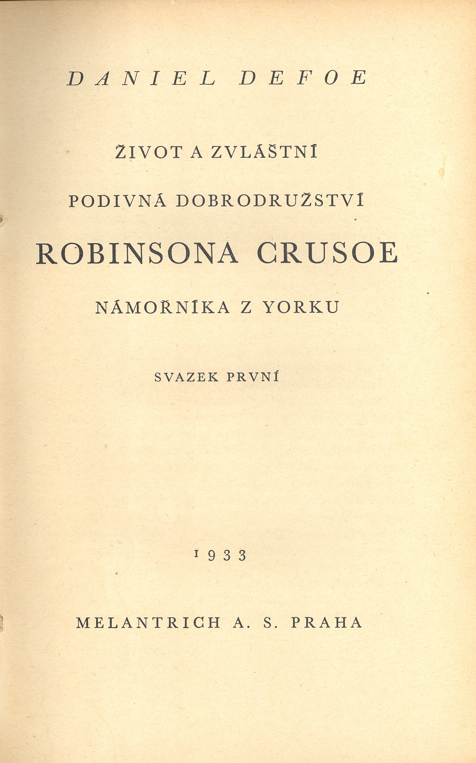 Title information Život a zvláštní podivná dobrodružství Robinsona Crusoe námořníka z Yorku. Svazek první / Daniel Defoe ; přeložil a úvod napsal Albert Vyskočil Personal name Defoe, Daniel, asi 1661-1731 (Author) Další autoři Vyskočil, Albert, 1890-1966 (Translator) (Author of introduction) (Inscriber) Stothard, Thomas, 1755-1834 (Illustrator) Corporation Melantrich (nakladatelství) (Publisher) (Printer) (Printer of plates) Další var.názvy Robinson Crusoe Publication Praha : Melantrich a. s., 1933 Scope 295 stran, 9 listů nečíslované obrazové přílohy : ilustrace ; 20 cm ISBN (Vázáno) Edition Melantrichovy knižnice svazek LXXI