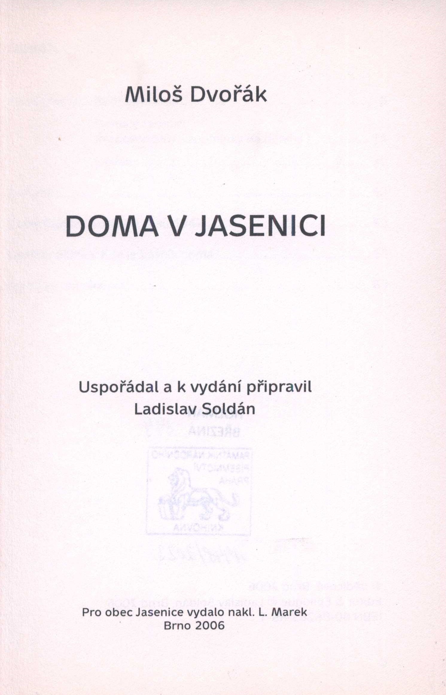 Názvové údaje Doma v Jasenici / Miloš Dvořák ; uspořádal a k vydání připravil Ladislav Soldán ; na přední straně obálky foto náhrobku od Pavla Tasovského, na zadní straně obálky korouhev jasenického kostela ; sazba a obálka Luboš Marek Osobní jméno Dvořák, Miloš, 1901-1971 (Autor) Další autoři Soldán, Ladislav, 1938- (Editor) (Dedikátor) (Autor podpisu) Tasovský, Pavel, 1960- (Fotograf) Marek, Luboš (Sazeč) (Autor obálky) Holman, Petr, 1951-2019 (Dedikant) Korp. L. Marek (nakladatelství) (Nakladatel, vydavatel) DAPE (tiskárna) (Tiskař) Údaje o vydání 1. vydání Nakladatel Brno : Pro obec Jasenice vydalo nakl. L. Marek, 2006 Výrobce DAPE Rozsah 63 stran : ilustrace, portréty, faksimile ; 20,5 cm ISBN 80-86263-85-1 (brožováno) Země vyd. Česko Jazyk dok. čeština Poznámky Zdobená tónovaná obálka. - Obsah. - Černobílé fotografie, portréty a faksimile s popiskami. - Ediční poznámka. - 500 výtisků.