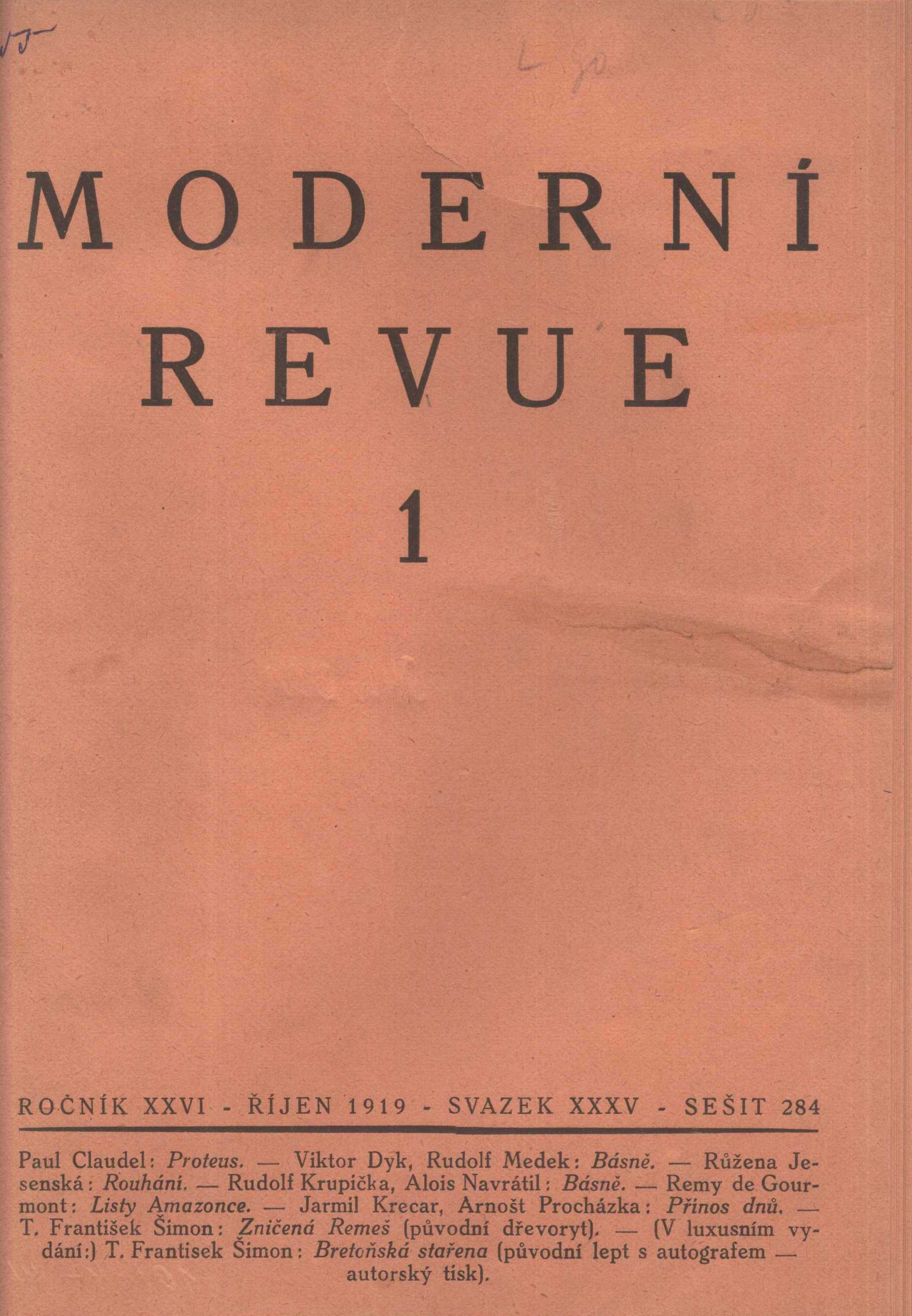 Title information Moderní revue : pro literaturu, umění a život Další autoři Procházka, Arnošt, 1869-1925 (Editor) (Publisher) Šimon, Tavík František, 1877-1942 (Graphic technician) (Wood -engraver) (Etcher) Vik, Karel, 1883-1964 (Graphic technician) (Wood -engraver) Švabinský, Max, 1873-1962 (Lithographer) (Graphic technician) (Etcher) Moravec, Alois, 1899-1987 (Graphic technician) (Wood -engraver) (Etcher) Honsa, Jan, 1876-1937 (Graphic technician) (Wood -engraver) Kobliha, František, 1877-1962 (Graphic technician) (Wood -engraver) (Etcher) Horký, František, 1879-1936 (Graphic technician) (Wood -engraver) (Etcher) Kotík, Pravoslav, 1889-1970 (Graphic technician) (Wood -engraver) (Etcher) Majer, Antonín, 1882-1963 (Graphic technician) (Wood -engraver) Mařík, Jaroslav, 1888-1965 (Graphic technician) (Wood -engraver) Milén, Eduard, 1891-1976 (Graphic technician) (Lithographer) Hodek, Josef, 1888-1973 (Graphic technician) (Wood -engraver) Corporation Moderní revue (nakladatelství) (Publisher) Lidová knihtiskárna J. Skalák a spol. (Printer) Roč., číslo Ročník 26, svazek 35, číslo 1-12, 1919/1920 Publication V Praze : Arnošt Procházka, 1919-1920 Manufacture Tiskem J. Skaláka Scope 593 stran, 5 nečíslovaných stran obsahu ročníku : ilustrace Country Czech Republic Language Czech Note Dvanáct čísel v deseti sešitech. - Celostránkové obrazové přílohy na slabším papíře zahrnuté do paginace: č. 1 (Tavík František Šimon: Zničená Remeš, dřevoryt), č. 2 (Karel Vik: Krajina z "Ataly", dřevoryt), č. 3 (Max Švabinský: Tygří lov, litografie), č. 4 (Jan Honsa: Průčelí Pachtova paláce v Praze, dřevoryt), č. 5 (Alois Moravec: Nad hrobem, dřevoryt), č. 6 (František Kobliha: Jarní noc, dřevoryt), č. 7 (Karel Vik: Metelice, dřevoryt), č. 8 (František Horký: Staroměstské náměstí, dřevoryt), č. 9 (Pravoslav Kotík: Napájení koní, dřevoryt), č. 10-12 (Antonín Majer: Dobré víly, dřevoryt; Jaroslav Mařík: Motiv z Kácova, dřevoryt; Edvard Milén: V divadle, litografie). - Luxusní vydání obsahovala následující originální signované přílohy: č. 1 (T. F. Šimon: Bretoňská stařena, lept), č. 2 (Karel Vik: Česká krajina, dřevoryt), č. 3 (Max Švabinský: Eden, lept), č. 4 (Jan Honsa: Ze staré Prahy: "U Zahrádků", dřevoryt), č. 5 (Alois Moravec: Jaro, lept), č. 6 (František Kobliha: V žáru červencovém, lept), č. 7 (Karel Vik: Zasněžená chalupa, dřevoryt), č. 8 (František Horký: Mikulášský chrám na Malé straně, lept), č. 9 (Pravoslav Kotík: Uprchlíci, lept), č. 10-12 (Josef Hodek: Ex libris, dřevoryt, ručně umělcem kolorovaný; František Kobliha, Krajina, lept; Jaroslav Mařík: Zámek Český Šternberk, dřevoryt). - Vedle básní (např. Viktor Dyk, Rudolf Medek, František Čerka), kratších prozaických textů (např. Růžena Jesenská) a kritických rubrik v ročníku vycházejí na pokračování následující díla: Paul Claudel: Proteus (č. 1-6), Rémy de Gourmont: Listy Amazonce, Julius Slowacki: Genese z ducha. - Pravidelné rubriky. - Opravy.