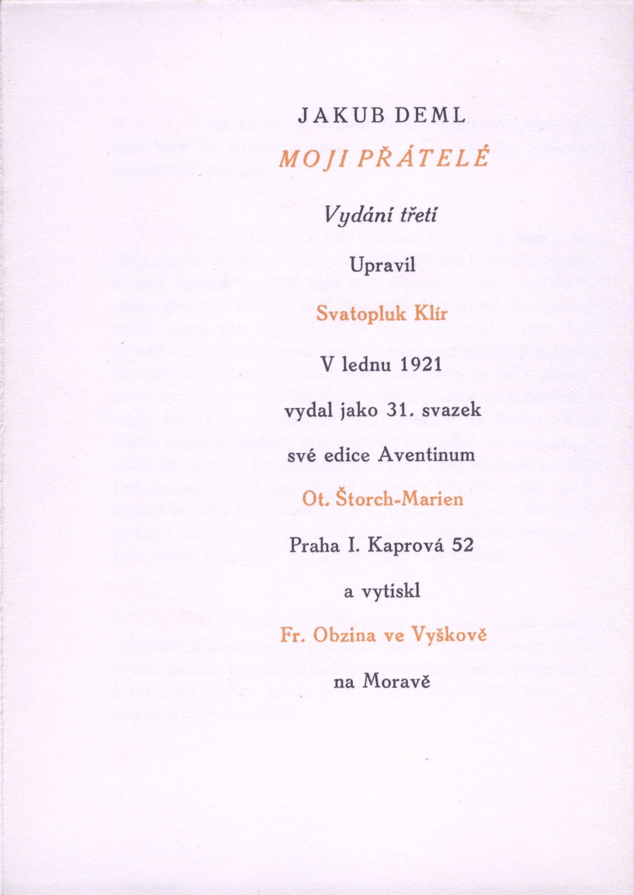 Edice Aventinum, (Aventinum)Country Czech Republic Language Czech Note Přesný rozsah: [4], 38, [6] s. - Úprava Svatopluk Klír. - Na začátku i konci knihy ozdobné předsádkové listy. - Zdobená obálka. - Titulní list zdoben rámcem a vinětou, tištěn dvojbarevně: béžově a černě. - Dvojbarevný tisk knihy: béžový a černý.