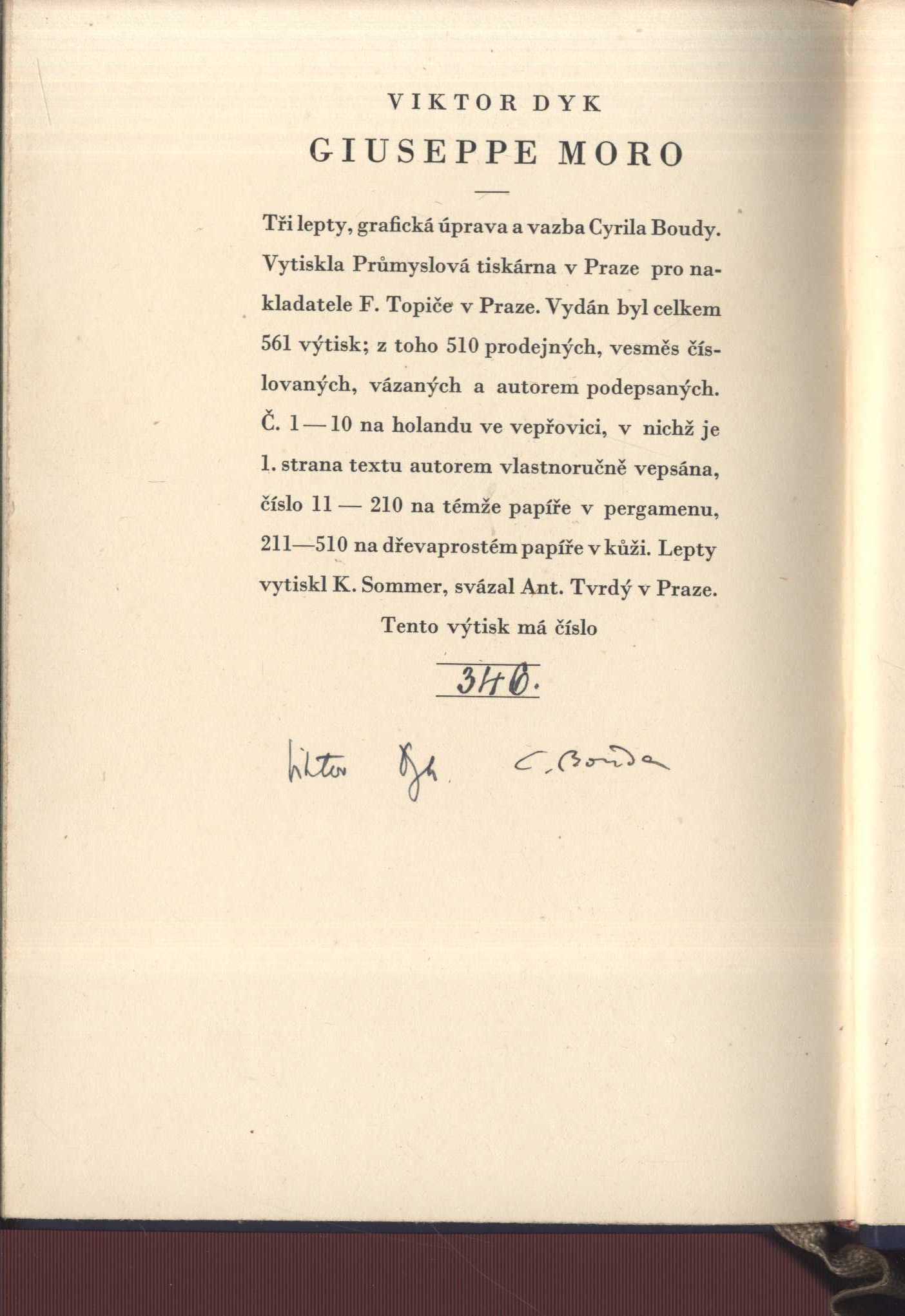 Title information Giuseppe Moro : psáno na jaře 1910 / Viktor Dyk ; [tři lepty, grafická úprava a vazba Cyrila Boudy ; vytiskl K. Sommer ; svázal Ant. Tvrdý] Personal name Dyk, Viktor, 1877-1931 (Author) Další autoři Bouda, Cyril, 1901-1984 (Illustrator) (Binding designer) (Book designer) Tvrdý, Antonín, 1888-1961 (Binder) Sommer, K. Corporation F. Topič (nakladatelství) (Publisher) Průmyslová tiskárna v Praze (Printer) Publication Praha : F. Topič, 1930 Manufacture (Průmyslová tiskárna) Scope 76 s. : il. ISBN (váz.) Country Czech Republic Language Czech Note Přesný rozsah: 76, [4] s. - Zdobená vazba. - Dvoubarevně (červeně a černě) tištěný titulní list. - "Tři lepty, grafická úprava a vazba Cyrila Boudy." - Náklad 561 výtisků, z toho 510 prodejných, vesměs číslovaných, vázaných a autorem podepsaných. Č. 1-10 na holandu ve vepřovici, v nichž je 1. strana textu autorem vlastnoručně vepsána, číslo 11-210 na témže papíře v pergamenu, 211-510 na dřevaprostém papíře v kůži. Lepty vytiskl K. Sommer, svázal Ant. Tvrdý v Praze."
