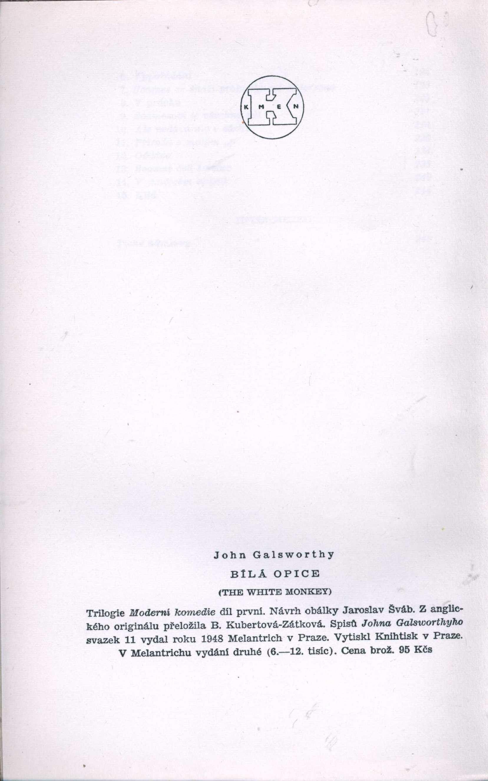 Title information Bílá opice = The white monkey : [první díl trilogie Moderní komedie] / John Galsworthy ; [návrh obálky Jaroslav Šváb ; z anglického originálu přeložila B. Kubertová-Zátková] Personal name Galsworthy, John, 1867-1933 (Author) Uniform title Moderní komedie Další autoři Šváb, Jaroslav, 1906-1999 (Bookjacket designer) Kubertová-Zátková, Bohumila, 1883-1971 (Translator) Corporation Melantrich (nakladatelství) (Publisher) Edition statement V Melantrichu vyd. 2. Publication V Praze : Melantrich, 1948 Manufacture Knihtisk) Scope 260 s. Edition Spisy Johna Galsworthyho sv. 11