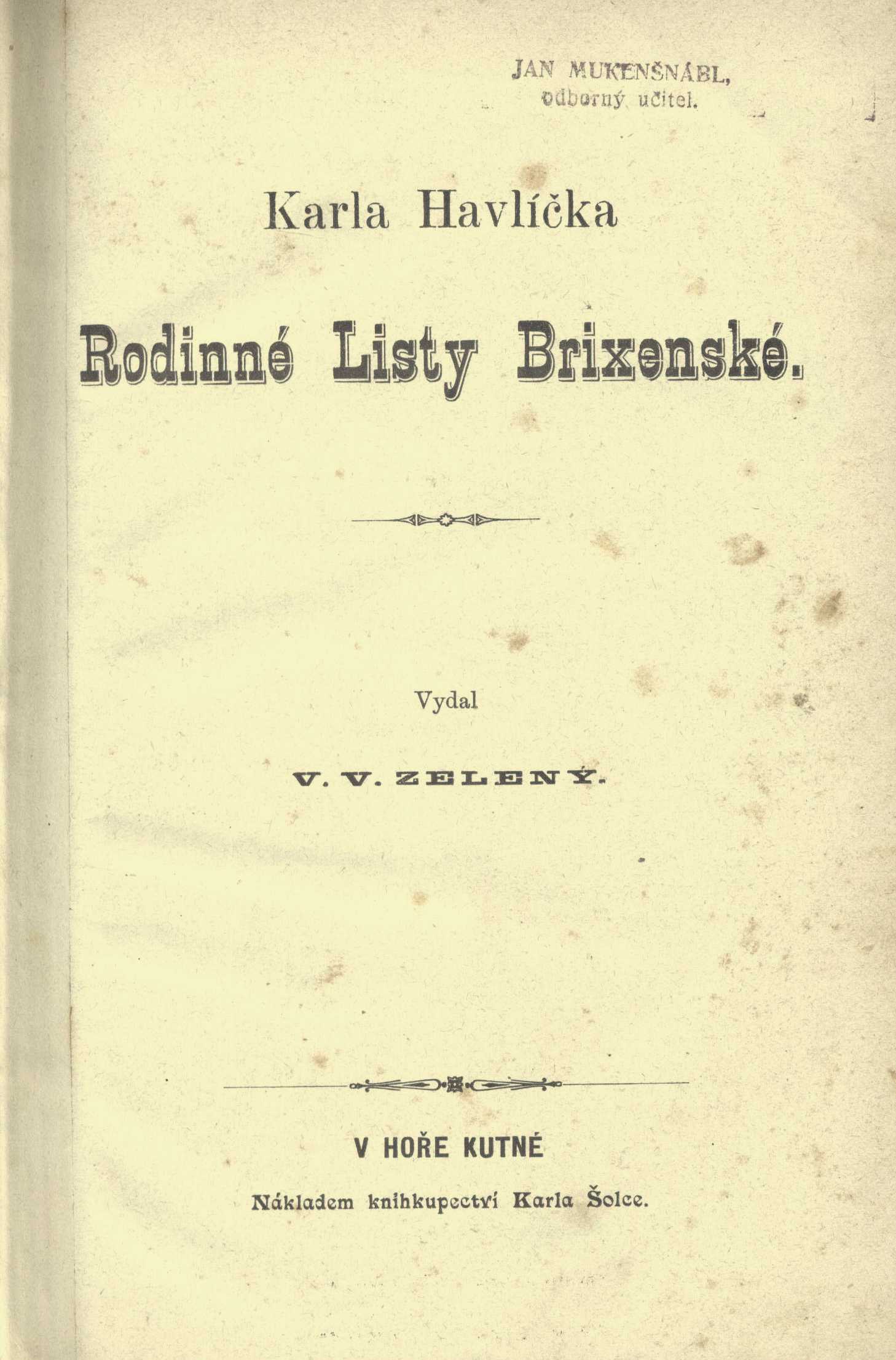 Title information Karla Havlíčka Rodinné listy brixenské / vydal V.V. Zelený Personal name Havlíček Borovský, Karel, 1821-1856 (Author) Další autoři Zelený, Václav Vladimír, 1858-1892 (Editor) Corporation Karel Šolc (nakladatelství, tiskárna, knihkupectví) (Publisher) Publication V Hoře Kutné : Nákladem knihkupectví Karla Šolce, [1896] Manufacture (Knihtiskárna Karla Šolce) Scope 232 s. ISBN (váz.) Country Czech Republic Language Czech Note Barev. vazba s tiskem na hřbetě. -- Zdob. přídeští. -- Dodatek Havlíčkovy poslední rodinné listy. -- Tiskové omyly. -- V závěru knihy anotace. -- Převazba.