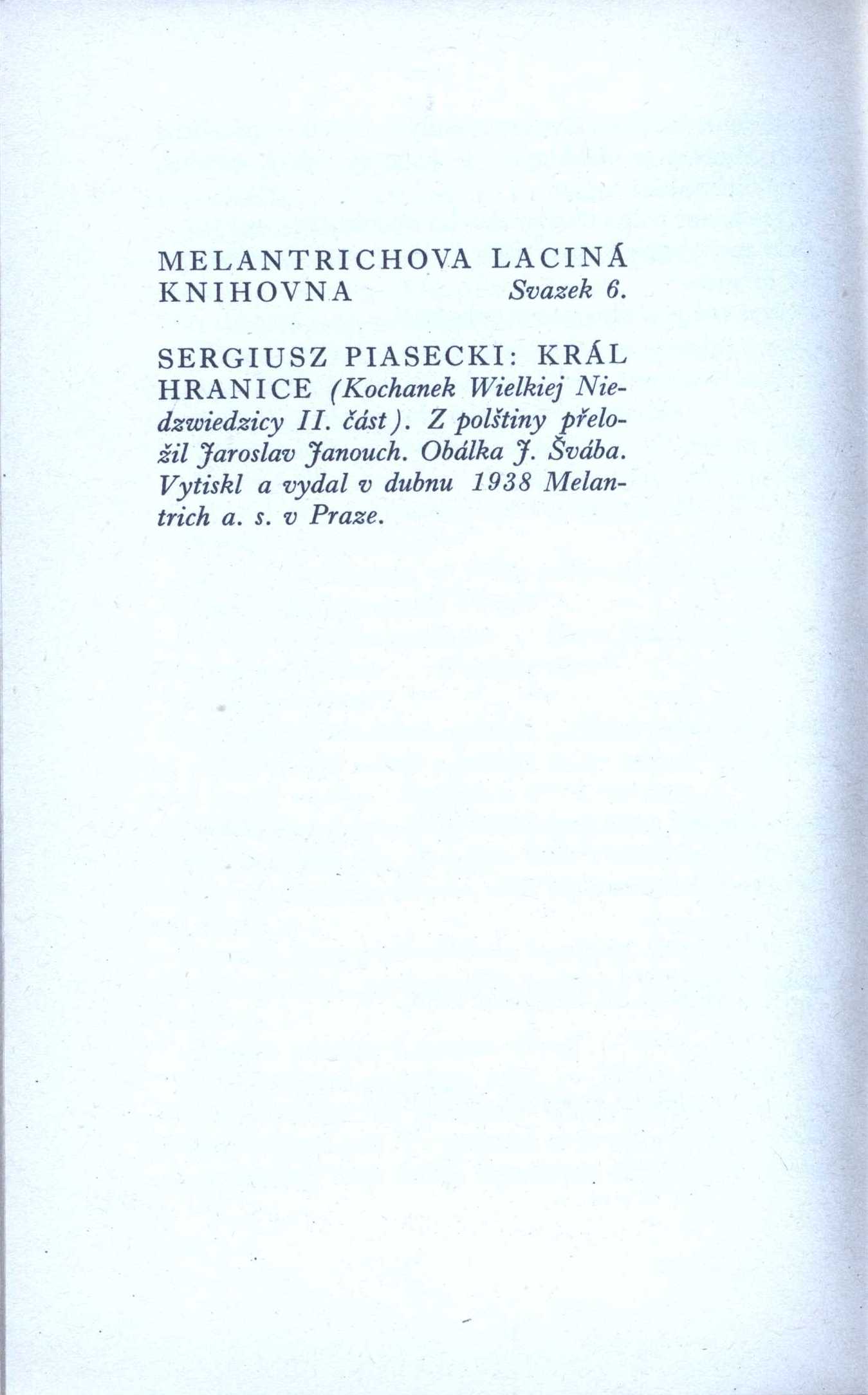Title information Král hranice : román / Sergiusz Piasecki ; [z polštiny přeložil Jaroslav Janouch ; obálka J. Švába] Personal name Piasecki, Sergiusz, 1901-1964 (Author) Další autoři Janouch, Jaroslav, 1903-1970 (Translator) Šváb, Jaroslav, 1906-1999 (Bookjacket designer) Corporation Melantrich (nakladatelství) (Publisher) Publication Praha : Melantrich, 1938 Scope 190 s. ISBN brož. Edition Melantrichova laciná knihovna sv. 6.
