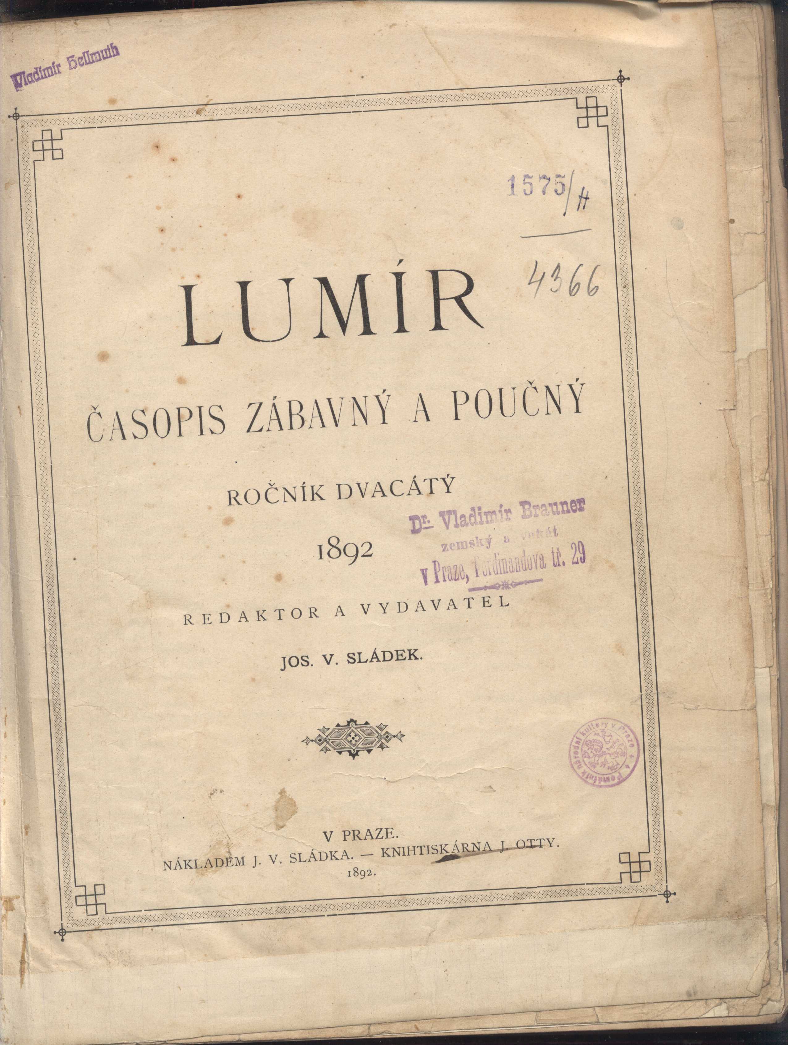 Title information Lumír : časopis zábavný a poučný Další autoři Sládek, Josef Václav, 1845-1912 (Editor) (Publisher) Brauner, Vladimír, 1853-1924 (Former owner) Corporation J. Otto (nakladatelství) (prt (nakladatelství)) Roč., číslo ročník 20, číslo 1-36, 1892 Publication V Praze : J. V. Sládek, 1892 Manufacture (Knihtiskárna J. Otty) Scope 428 s., [4] s. obsahu ročníku Country Czech Republic Language Czech Note V ročníku vycházejí na pokračování např. tyto práce: J. Zeyer: Tři legendy o krucifixu, K. V. Rais: Dřínův Józa, R. Kipling: Emira, J. L. Hrdina: Pan Dominus, P. Bourget: Světec, F. Herites: Na vždy stajeno, J. Konrád: U dvou kocourů, J. L. Hrdina: Hnízdo skřivanů, J. Zeyer: Obnovené obrazy, F. Austey: Mluvící kůň.