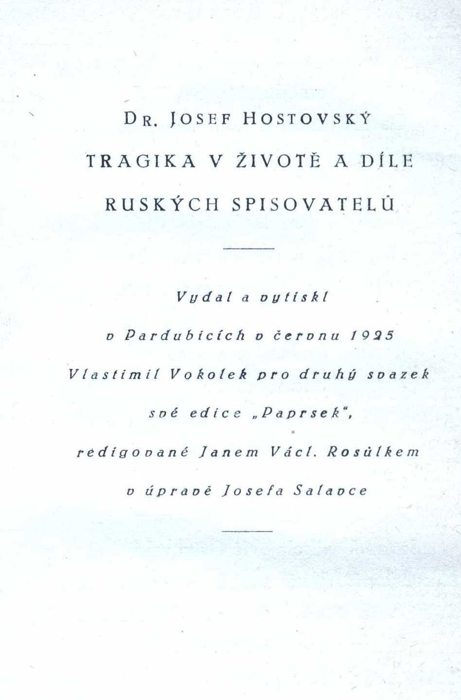 Title information Tragika v životě a díle ruských spisovatelů : a jiné články o ruské literatuře / Josef Hostovský Personal name Hostovský, Josef, 1882-1965 (Author) (Dedicator) Další autoři Slabý, Zdeněk Karel, 1930-2020 (Dedicatee) Publication V Pardubicích : Vydal a vytiskl Vlastimil Vokolek, 1925 Scope 217 s. Edition Paprsek sv. 2