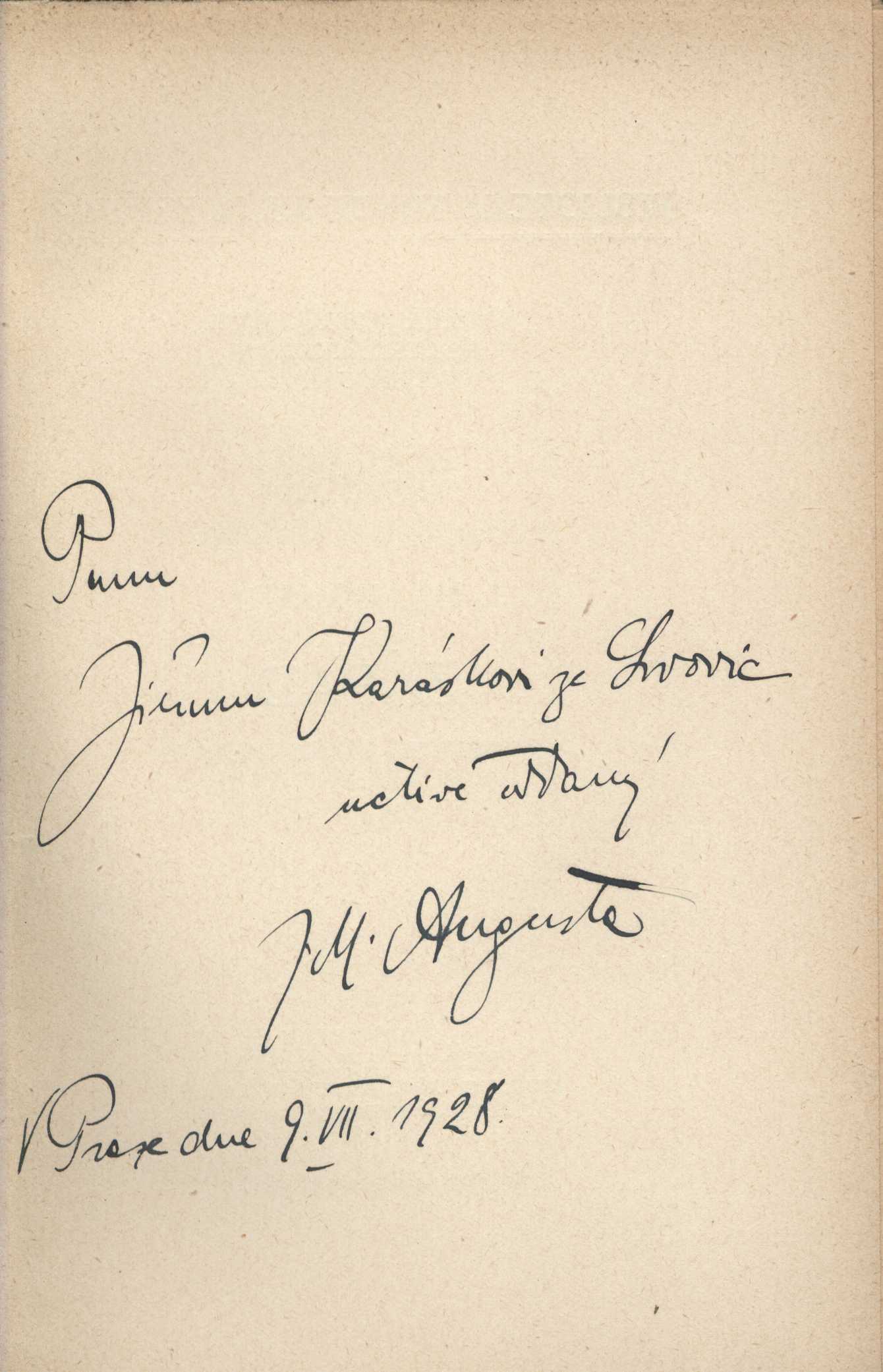 U sign. KaG XVI B 198: Knihtiskárna Alois Lapáček v Praze-V. - Na první straně rukopisná dedikace J. M. Augusty Jiřímu Karáskovi ze Lvovic perem: "Panu Jiřímu Karáskovi ze Lvovic uctivě oddaný J. M. Augusta V Praze dne 9. VIII. 1928.".