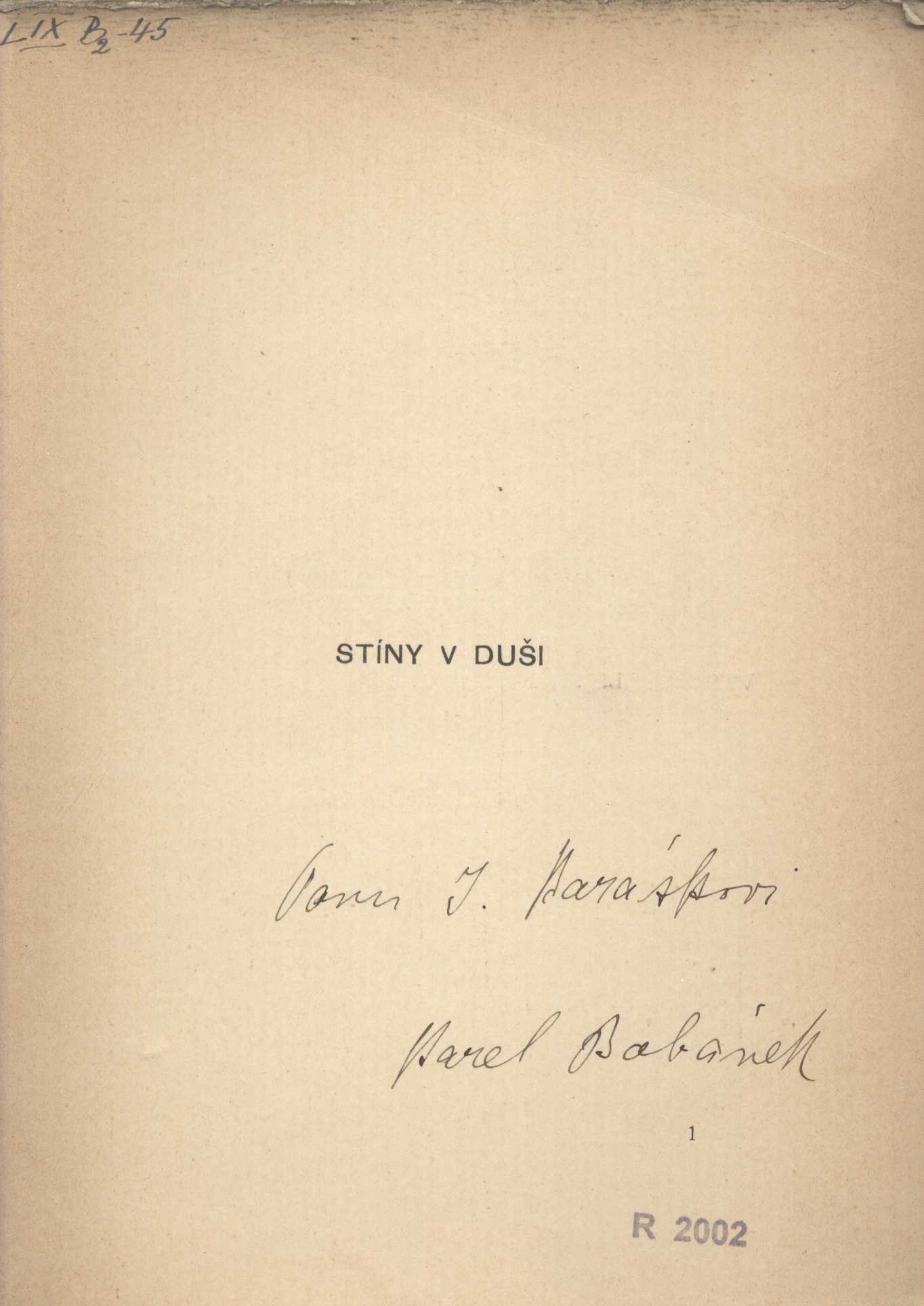 Signatura P 5 F 67: Původní brož. - Rozpad vazby. - Obálka na okrajích poškozena degradací papíru, ve hřbetu slepena papírovou lepicí páskou. - Na patitulu dedikace autora slečně Juránkové [?].