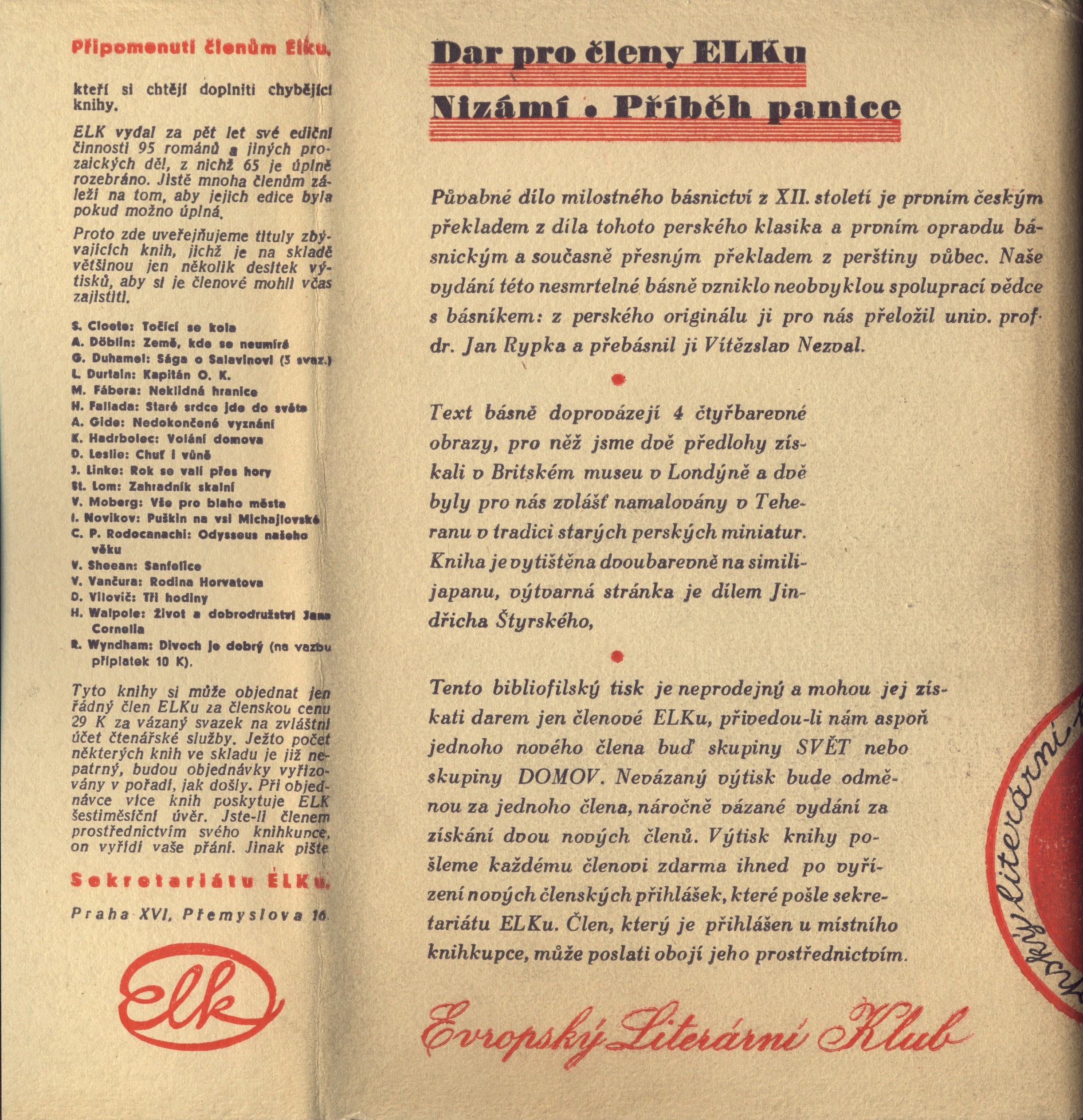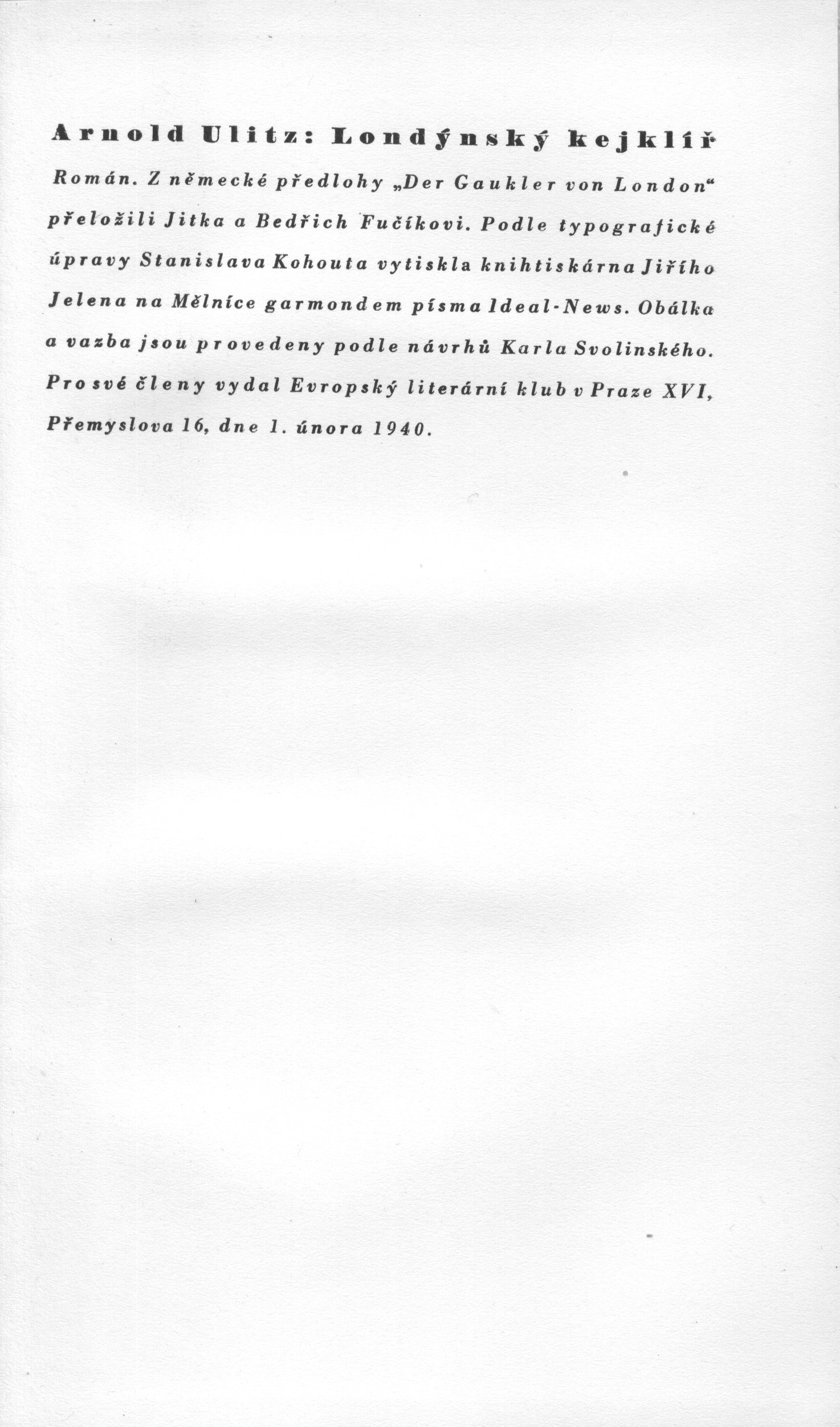 Title information Londýnský kejklíř : román / Arnold Ulitz ; [z německé předlohy ... přeložili Jitka a Bedřich Fučíkovi ; podle typografické úpravy Stanislava Kohouta ; obálka a vazba jsou provedeny podle návrhů Karla Svolinského] Personal name Ulitz, Arnold, 1888-1971 (Author) Další autoři Fučíková, Jitka, 1903-1987 (Translator) Fučík, Bedřich, 1900-1984 (Translator) Kohout, Stanislav, -1965 (Typographer) Svolinský, Karel, 1896-1986 (Bookjacket designer) (Binding designer) (Illustrator) Corporation Evropský literární klub (nakladatelství) (Publisher) Corporation knihtiskárna Jiřího Jelena na Mělníce (Mělník (Česko)) (Printer) Publication Praha : Evropský literární klub, 1940 Manufacture knihtiskárna Jiřího Jelena) Scope 346 s. ; 22 cm ISBN (váz.) Country Czech Republic Language Czech Language of the original German Note Zdob. barev. vazba s tiskem na hřbetě. -- Nakl. značka na vakátě. -- Čb. ilustr. na tit. listu. -- Doslov "Arnold Ulitz" od V. J.