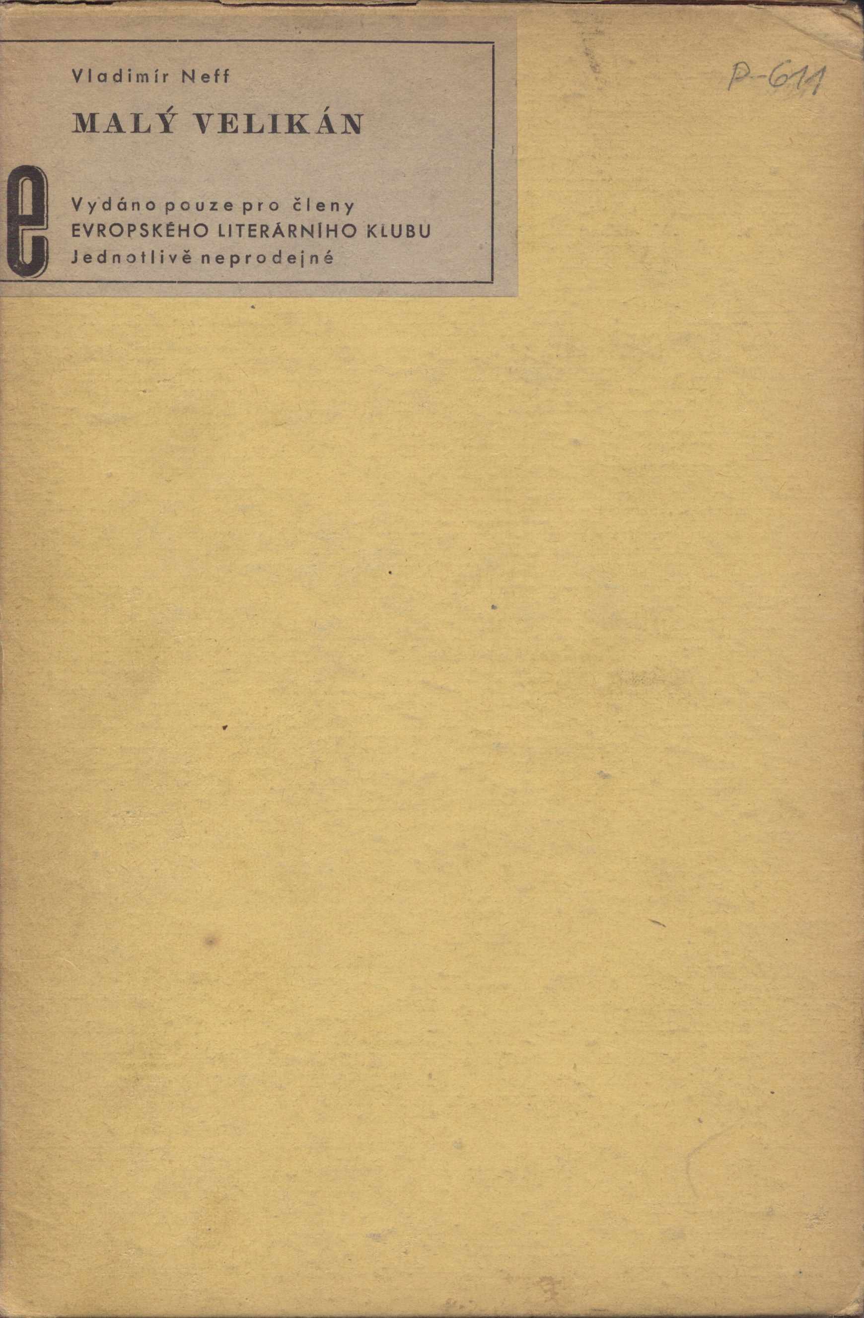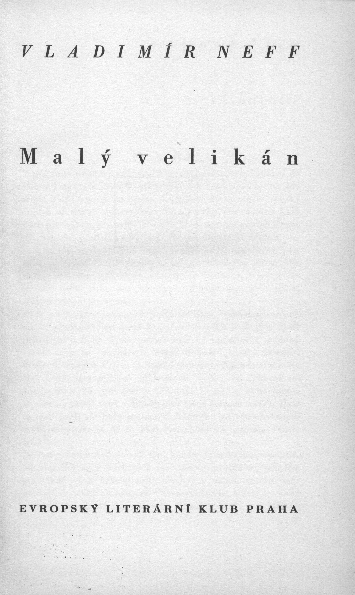 Title information Malý velikán : [román] / Vladimír Neff ; [podle typografické úpravy J. Štyrského ; vazba i ochranný obal jsou provedeny podle návrhu Františka Muziky] Personal name Neff, Vladimír, 1909-1983 (Author) Další autoři Štyrský, Jindřich, 1899-1942 (Typographer) Muzika, František, 1900-1974 (Binding designer) Corporation Evropský literární klub (nakladatelství) (Publisher) Jiří Jelen (tiskárna) (Printer) Publication Praha : Evropský literární klub, 1935 Manufacture knihtiskárna J. Jelena) Scope 348 s. ; 22 cm ISBN (váz.) Country Czech Republic Language Czech Note Zdob. barev. plát. vazba s tiskem na hřbetě. -- Černé přídeští. -- Nakl. značka na vakátě.
