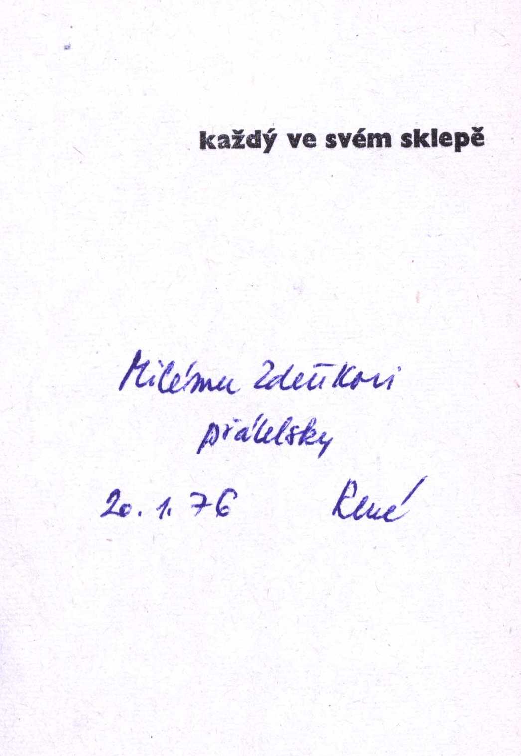 1. Title informationKaždý ve svém sklepě / René Ditmar ; [přebal, vazbu a frontispce navrhl Jaroslav Fišer ; graficky upravil Jan Wild]
