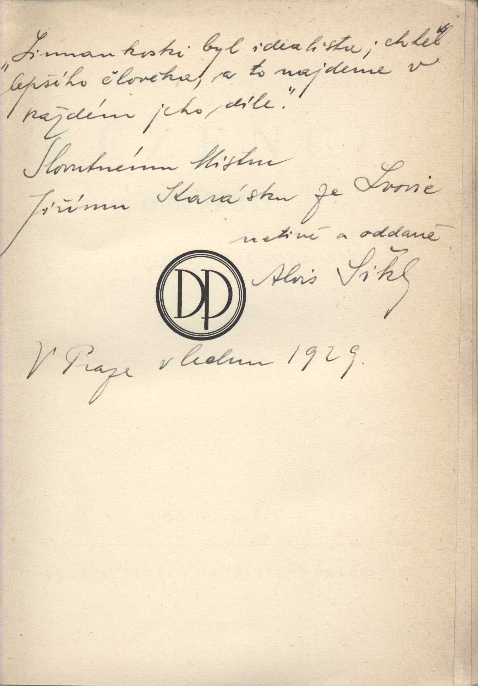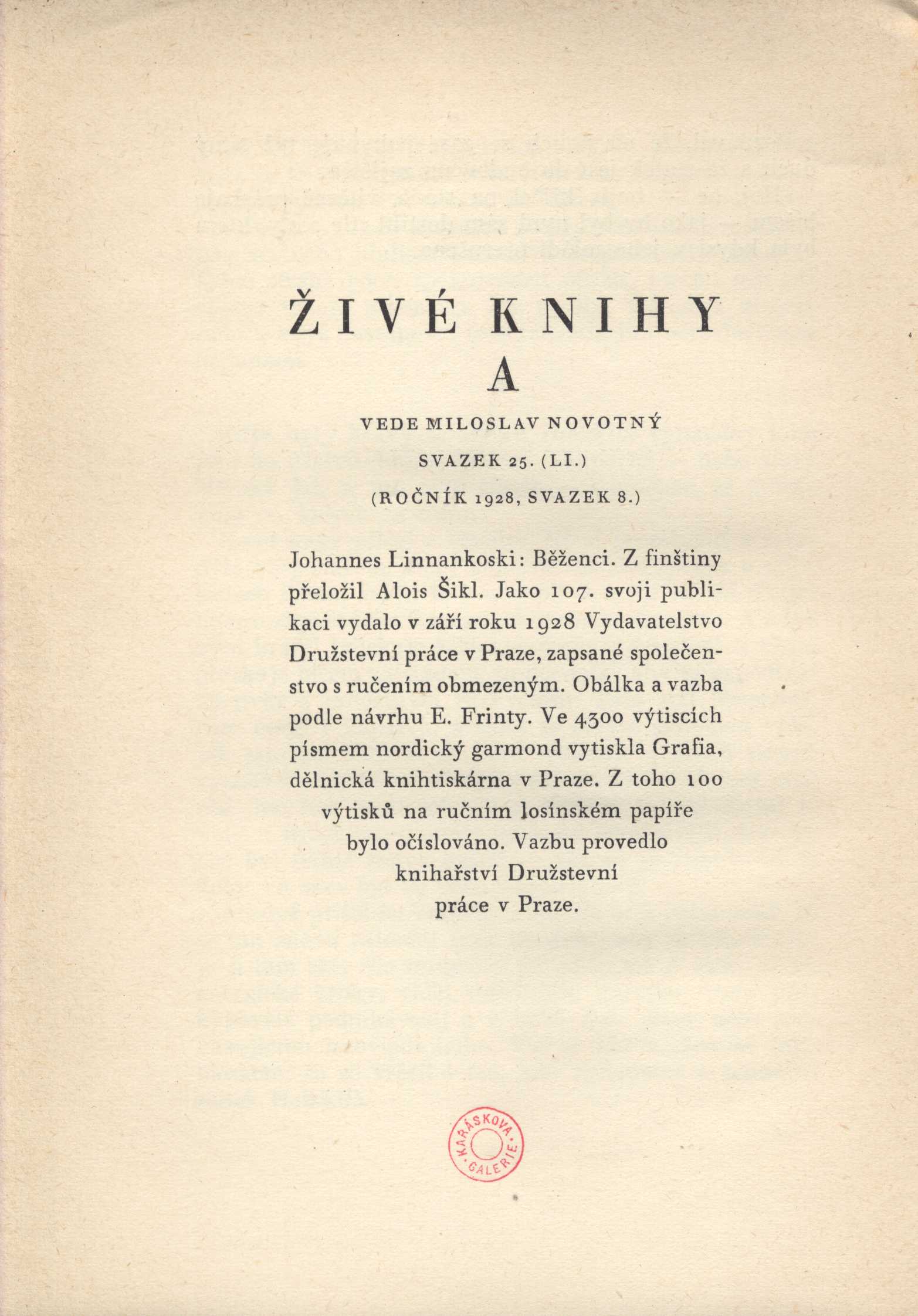 U sign. KaG XII C2 50: "Z finštiny přeložil Alois Šikl. Jako 107. svoji publikaci vydalo v září roku 1928 Vydavatelstvo Družstevní práce v Praze, zapsané společenstvo s ručením obmezeným. Obálka a vazba podle návrhu E. Frinty. Ve 4300 výtiscích písmem nordický garmond vytiskla Grafia, dělnická knihtiskárna v Praze. Z toho 100 výtisků na ručním papíře bylo očíslováno. Vazbu provedlo knihařství Družstevní práce v Praze." - Na první straně knihy rukopisná dedikace Aloise Šikla Jiřímu Karáskovi ze Lvovic: "Linnakoski byl idealista; chtěl lepšího člověka, a to najdeme v každém jeho díle." Slovutnému Mistru Jiřímu Karáskovi ze Lvovic uctivě a oddaně Alois Šikl V Praze v lednu 1929.".