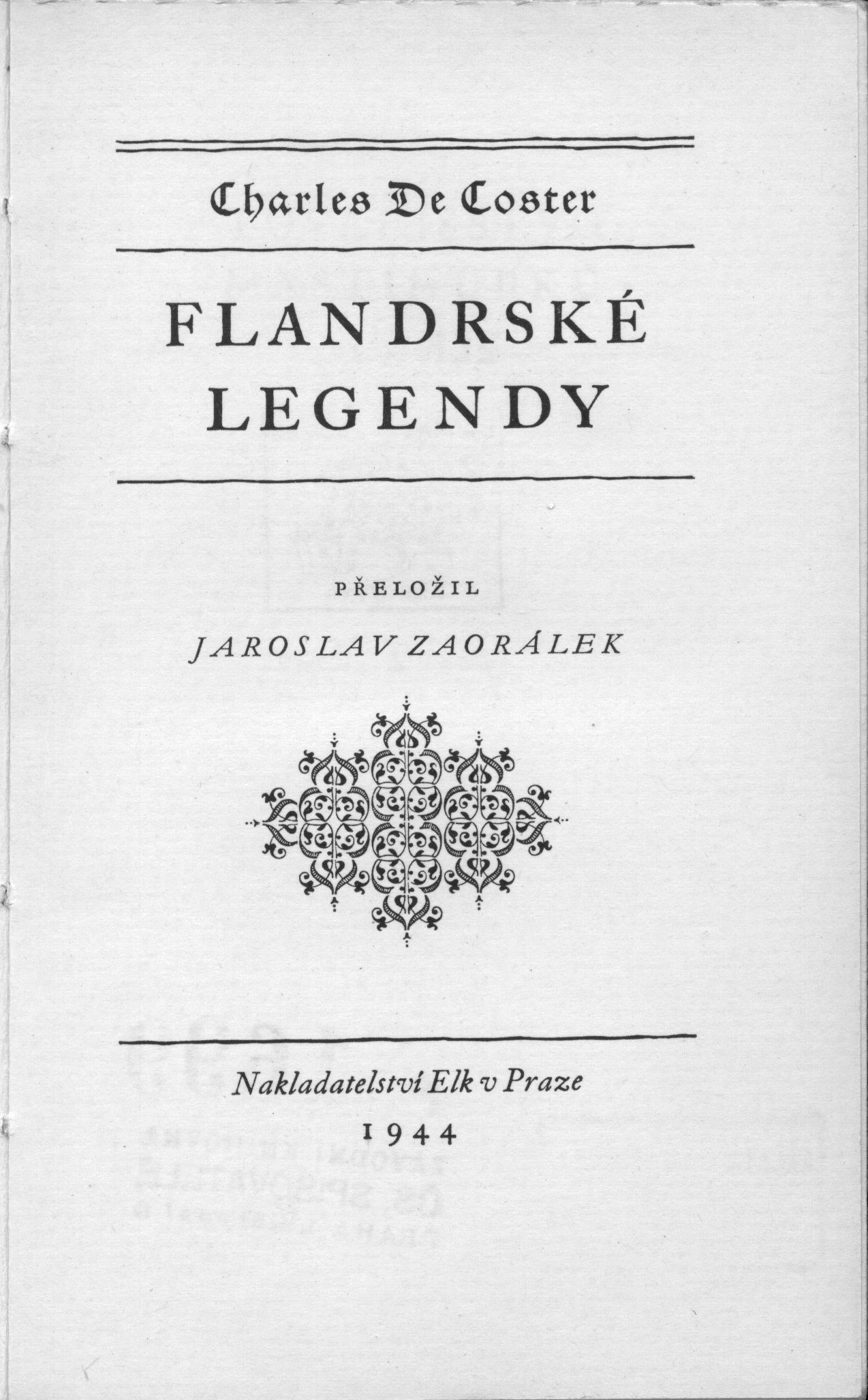 Title information Flandrské legendy / Charles De Coster ; přeložil Jaroslav Zaorálek ; [slovo o autorovi Vojtěch Jirát ; dřevořez na obálce Ferdiš Duša ; typografická úprava Oldřich Menhart] Personal name De Coster, Charles Théodore Henri, 1827-1879 (Author) Další autoři Zaorálek, Jaroslav, 1896-1947 (Translator) Jirát, Vojtěch, 1902-1945 (Author of introduction) Duša, Ferdiš, 1888-1958 (Illustrator) Menhart, Oldřich, 1897-1962 (Typographer) Hellmuthová, Marta, 1917-1988 (Dedicator) Hellmuth-Brauner, Vladimír, 1910-1982 (Dedicatee) (Former owner) Corporation Evropský literární klub (nakladatelství) (Publisher) Průmyslová tiskárna v Praze (Printer) Karel Kryl (firma: Kroměříž, Česko) (Printer of plates) Edition statement 1. neilustrované, celkem druhé Publication V Praze : Nakladatelství Elk, 1944 Manufacture (Průmyslová tiskárna) Scope 300 s. ; 18 cm ISBN brož. Country Czech Republic Language Czech Language of the original French Note Zdobený přebal (F. Duša). - Slepá obálka. - Na záložkách obálky anotace a citace z ohlasů. - Nakladatelský signet. - Vinětová výzdoba. - Typografie O. Menharta. - Sazba písmem Caslon. - Jako závěr "Slovo o autorovi" od V. Jiráta. - Obálku vytiskl Karel Kryl v Kroměříži. - V rámci nákladu tři sta výtisků na bílém papíře bez dřeva