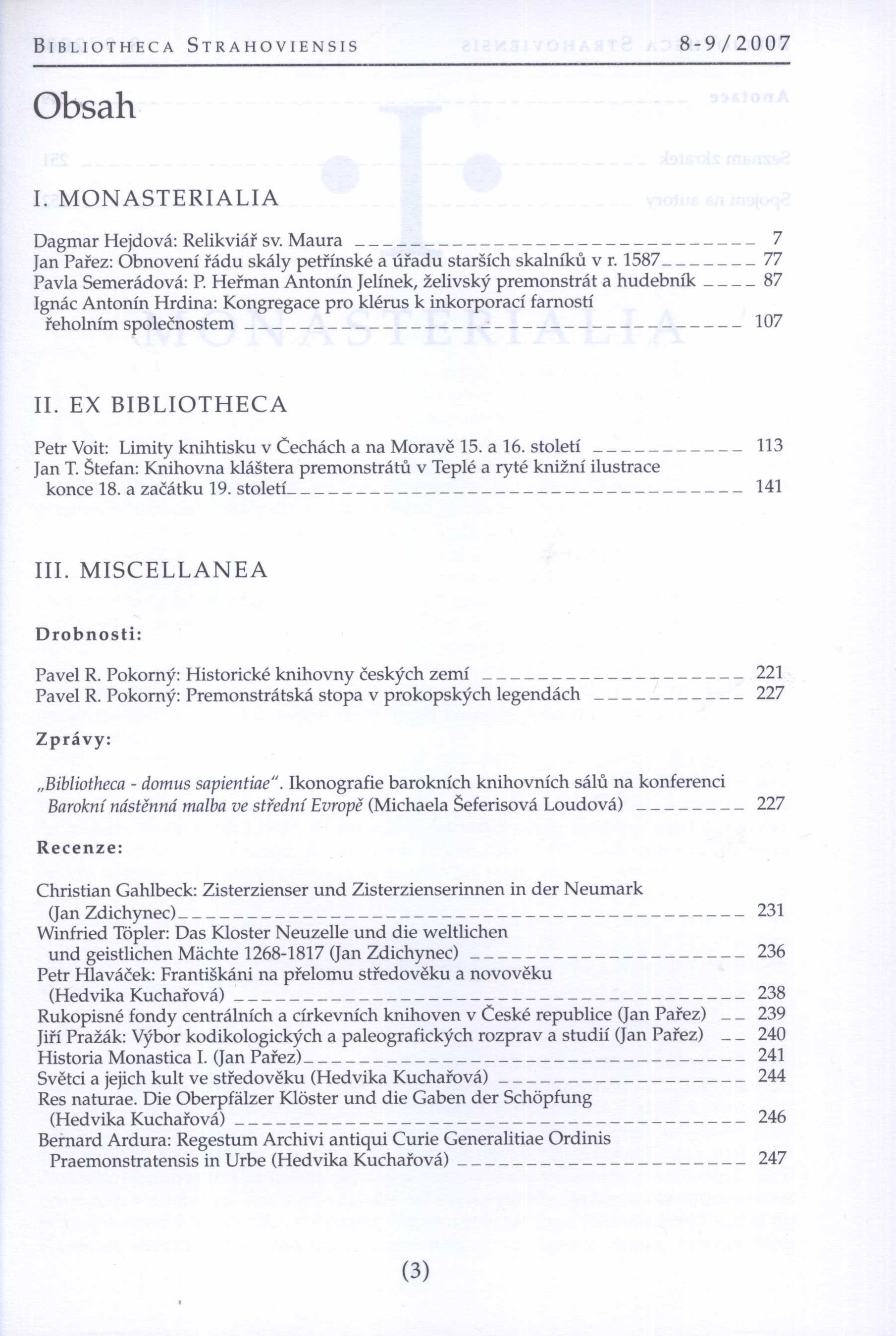 Názvové údaje Bibliotheca Strahoviensis / redakce Jan Pařez Další autoři Pařez, Jan, 1961- (Redaktor, výkonný redaktor) Korp. Strahovský klášter. Knihovna (Nakladatel, vydavatel) Strahovský klášter (Nakladatel, vydavatel) Tiskárna Duo Press (Tiskař) Roč., číslo Svazek 8-9, 2007 Údaje o vydání Vydání první Nakladatel Praha : Královská kanonie premonstrátů na Strahově, 2007 Výrobce Mnichovo Hradiště : DUO PRESS Rozsah 256 stran : fotografie, faksimile ; 23 cm ISSN 1213-6514 Země vyd. Česko Jazyk dok. čeština Poznámky Barevná obálka. - Čb. fotografie a faksimile. - Resumé anglicky a německy . - 500 výtisků