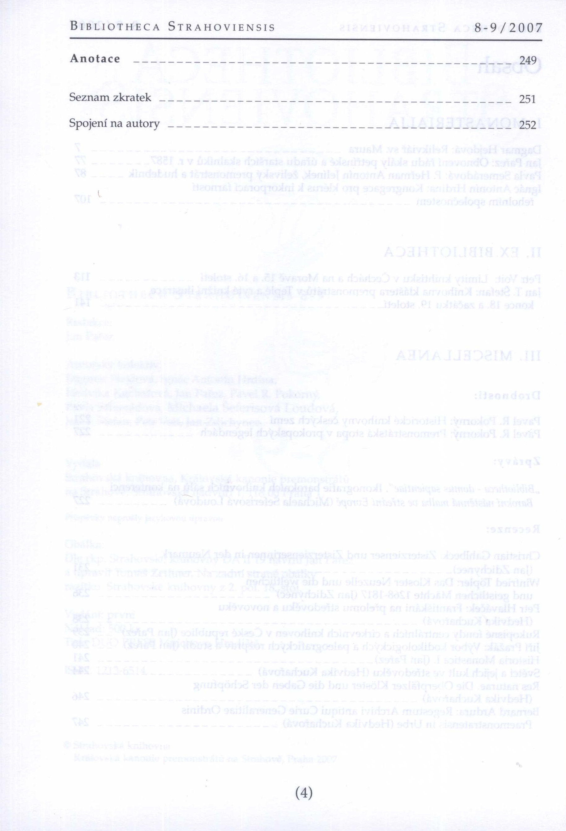 Title information Bibliotheca Strahoviensis / redakce Jan Pařez Další autoři Pařez, Jan, 1961- (Redactor) Corporation Strahovský klášter. Knihovna (Publisher) Strahovský klášter (Publisher) Tiskárna Duo Press (Printer) Roč., číslo Svazek 8-9, 2007 Edition statement Vydání první Publication Praha : Královská kanonie premonstrátů na Strahově, 2007 Manufacture Mnichovo Hradiště : DUO PRESS Scope 256 stran : fotografie, faksimile ; 23 cm ISSN 1213-6514 Country Czech Republic Language Czech Note Barevná obálka. - Čb. fotografie a faksimile. - Resumé anglicky a německy . - 500 výtisků