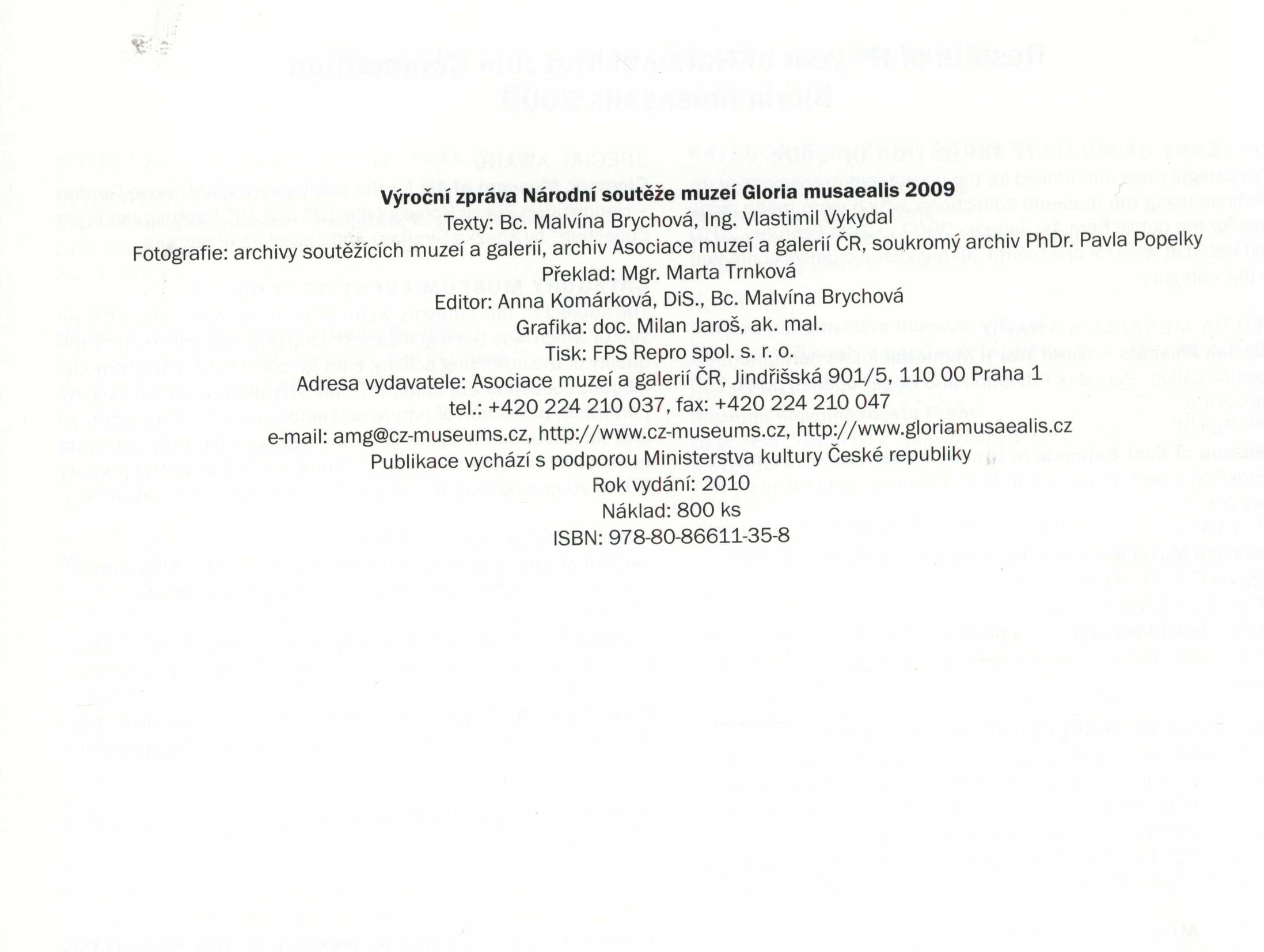 Title information Gloria musaealis 2009 : VIII. ročník Národní soutěže muzeí : výroční zpráva / texty Malvína Brychová, Vlastimil Vykydal ; překlad Marta Trnková ; editor Anna Komárková, Malvína Brychová ; grafika Milan Jaroš Main entry-action Gloria musaealis (8. : 2009 : Česko) Další autoři Brychová, Malvína (Author) (Editor) Vykydal, Vlastimil, 1947- (Author) Komárková, Anna (Editor) Trnková, Marta (Translator) Jaroš, Milan, 1953- (Book designer) Corporation Asociace muzeí a galerií České republiky (Praha) (Publisher) FPS Repro (firma) (Printer) Publication Praha : Asociace muzeí a galerií ČR, 2010 Manufacture FPS Repro spol. s.r.o. Scope 67 stran : ilustrace (převážně barevné) ; 21 cm ISBN 978-80-86611-35-8 (brožováno) Country Czech Republic Language Czech * English Note Zdobená barevná obálka. - Úvod. - Barevné fotografie. - Kategorie Muzejní výstavy. - Kategorie Muzejní publikace. - Muzejní počin roku. - Kategorie Cena Českého výboru ICOM. - Výsledky. - Částečný anglický text.