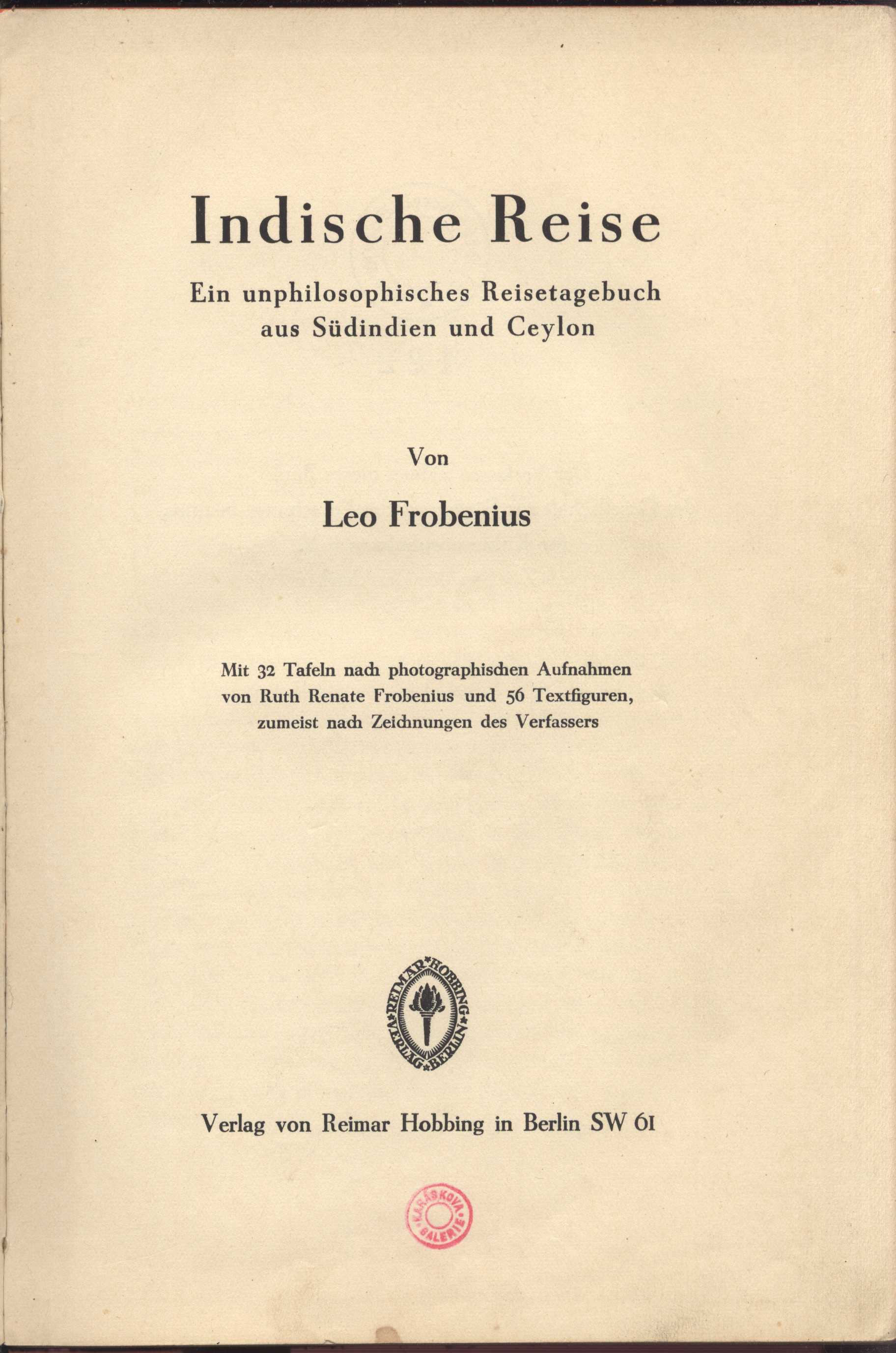 Title information Indische Reise : ein unphilosophisches Reisetagbuch aus Südindien und Ceylon / von Leo Frobenius ; mit 32 Tafeln nach photographischen Aufnahmen von Ruth Renate Frobenius und 56 Textfiguren, zumeist nach Zeichnungen des Verfassers Personal name Frobenius, Leo, 1873-1938 (Author) Další autoři Frobenius, Ruth Renate (Photographer) Corporation Verlag von Reimar Hobbing (Berlin (Německo)) (Publisher) Stadtbücherei (Bodenbach) (Former owner) (1931-1945) Wilhelm Büxenstein (Berlin, Německo) (Printer) Publication Berlin : Verlag von Reimar Hobbing, c1931 Manufacture (W. Büxenstein) Scope 295 s., 32 s. obr. příl. : il. ISBN (váz.) Country Germany Language German Note Zdobená vazba. - Úvod autora. - Na titulním listu nakladatelský signet. - Seznamy vyobrazení. - Černobílé kresby a mapky v textu. - Třicet dva stran obrazové přílohy (fotgrafie).