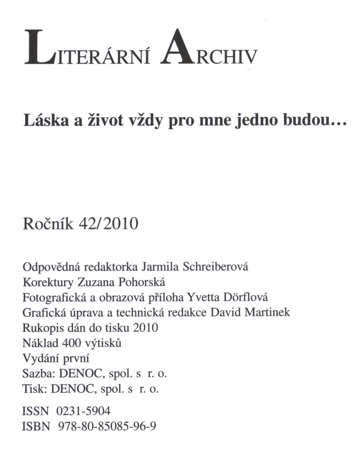 Title information Literární archiv : sborník Památníku národního písemnictví = Jahrbuch des Museums der tschechischen Literatur = Annual of the Museum of the Czech Literature = Almanach du Musée de la Littérature Tchèque. Láska a život vždy pro mne jedno budou--- : k 100. výročí narození Františka Hrubína / odpovědná redaktorka Jarmila Schreiberová ; fotografická o obrazová příloha Yvetta Dörflová ; grafická úprava a technická redakce David Martinek Další autoři Schreiberová, Jarmila, 1949- (Editor) Martinek, David, 1972- (Book designer) Dörflová, Yvetta, 1952- (Photographer) Corporation Památník národního písemnictví (muzeum literatury) (Publisher) Denoc, spol. s r.o. (tiskárna) (Printer) Roč., číslo 42, 2010 Další var.názvy Láska a život vždy pro mne jedno budou--- : k 100. výročí narození Františka Hrubína Edition statement Vydání první Publication Praha : Památník národního písemnictví, 2010 Manufacture Denoc, spol. s r. o. Scope 324 stran : ilustrace, portréty, faksimile ; 23 cm ISBN 978-80-85085-96-9 (brožováno) ISSN 0231-5904 Country Czech Republic Language Czech Note Na obálce karikatura Jaroslava Kándla. - Čb. fotografie a faksimile, barevné fotografie ilustrací v příloze. - Obsahuje bibliografické odkazy a bibliografie. - Anglická resumé. - 400 výtisků