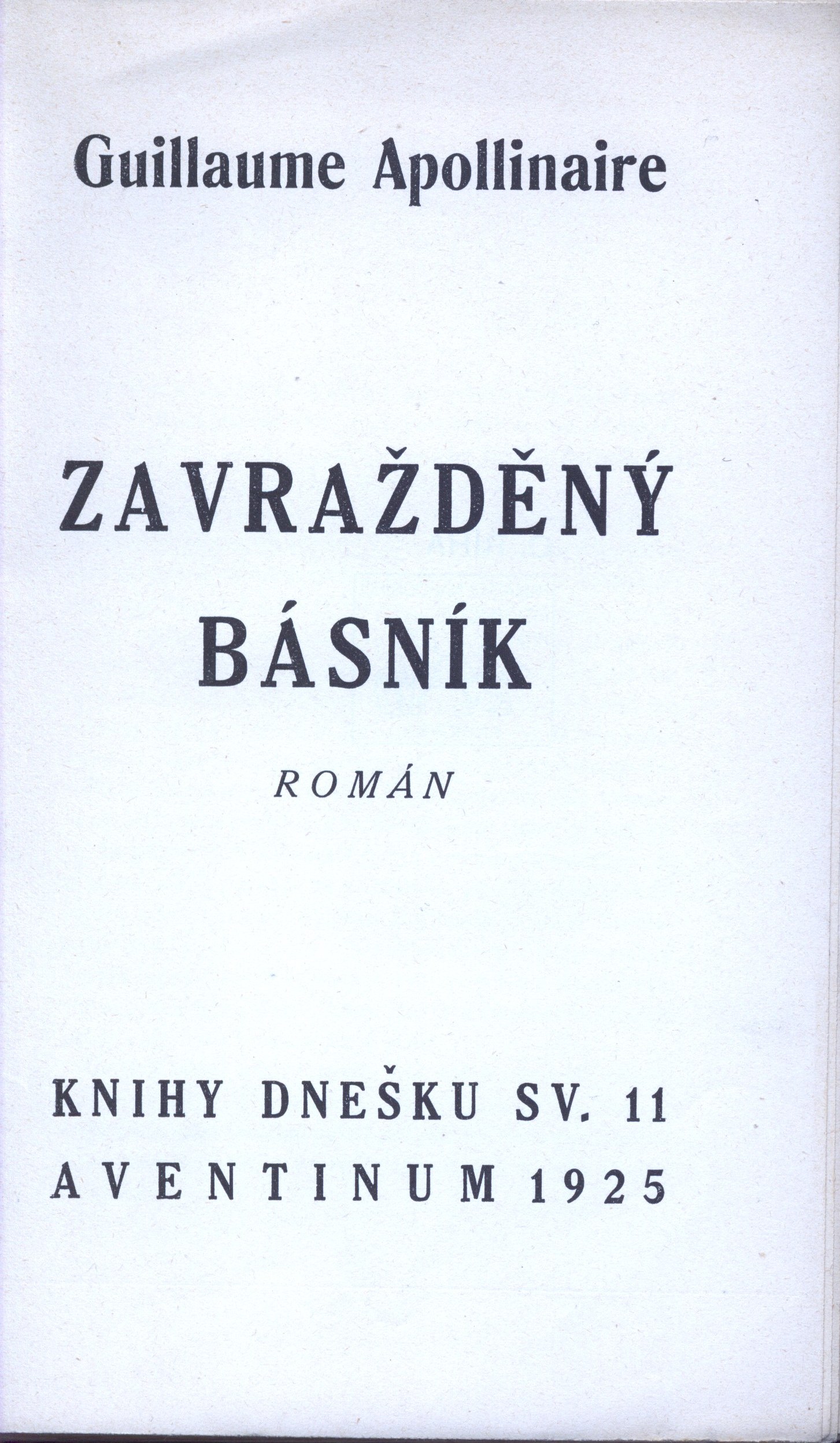 Title information Zavražděný básník : román / Guillaume Apollinaire ; autorisovaný překlad M. Šramla a J. Seiferta Personal name Apollinaire, Guillaume, 1880-1918 (Author) Další autoři Seifert, Jaroslav, 1901-1986 (Translator) Šraml, Max, 1902-1949 (Translator) Teige, Karel, 1900-1951 (Bookjacket designer) (Book designer) Mrkvička, Otakar, 1898-1957 (Bookjacket designer) Hořejší, Jindřich, 1886-1941 (Former owner) Corporation Dr. Ot. Štorch-Marien (nakladatelství) (Publisher) Aventinum (nakladatelství) (Publisher) František Obzina (tiskárna, nakladatelství) (Printer) Další var.názvy Román Publication Praha : Aventinum, Dr. Ot. Štorch-Marien, 1925 Manufacture Ve Vyškově na Moravě : knihtiskárna F. Obziny Scope 84 stran ; 22 cm ISBN (Brožováno) Edition Knihy dnešku ; sv. 11